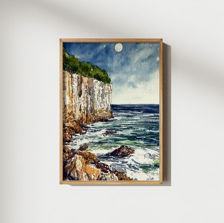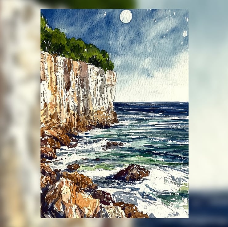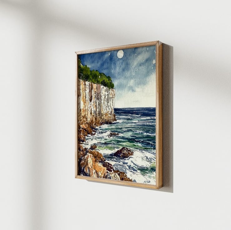 Moonlit Cliffs Watercolor Painting is a breathtaking depiction of a quiet, moonlit coastline. Towering limestone cliffs rise majestically above the sea, their rugged textures beautifully rendered in warm earth tones. Meanwhile, the moon glows softly overhead, casting a luminous light across the deep blue waters below. As the rhythmic waves move against the rocky shoreline, they add to the painting’s calming and meditative quality.