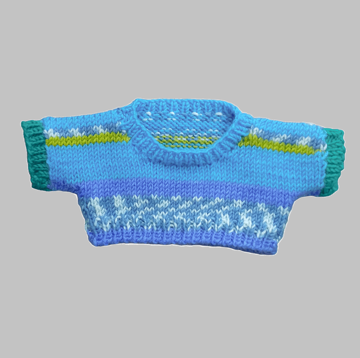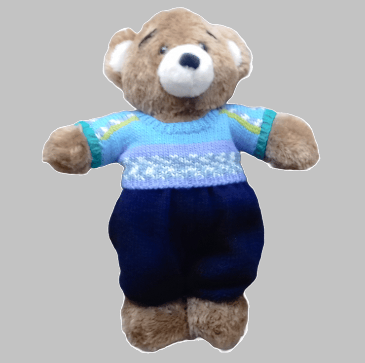 This hand knit PATTERN is for a T shirt sweater for a Teddy. To fit Teddy height: 38 (43: 48) cm or 15 (17: 19) inches. The T shirt is knitted in double knitting yarn using 3.25 mm and 4 mm knitting needles and is knit flat and seamed.
