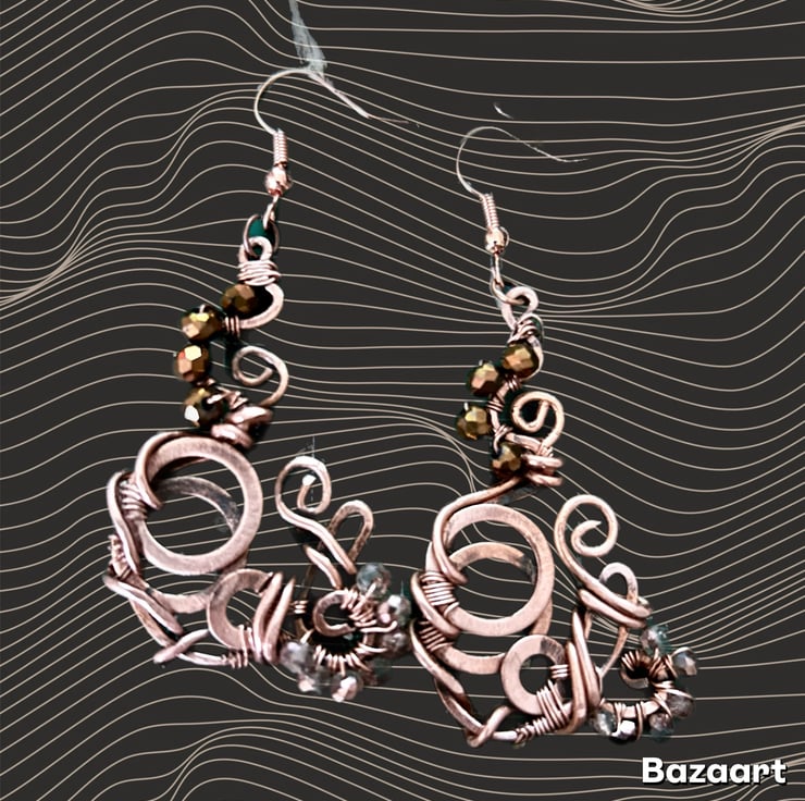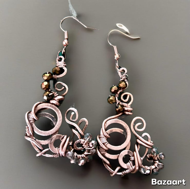 These beautiful earrings are vibrant and extremely eye catching. The oxidisation has been polished and to highlight the design. I have added glass crystal beads to finish the boho look. These earrings are extremely unusual and completely unique, no one else in the world will have this design. Only one pair made! Boho style and perfect for day or evening wear as they will compliment any outfit. Drop is approx 1.5”.