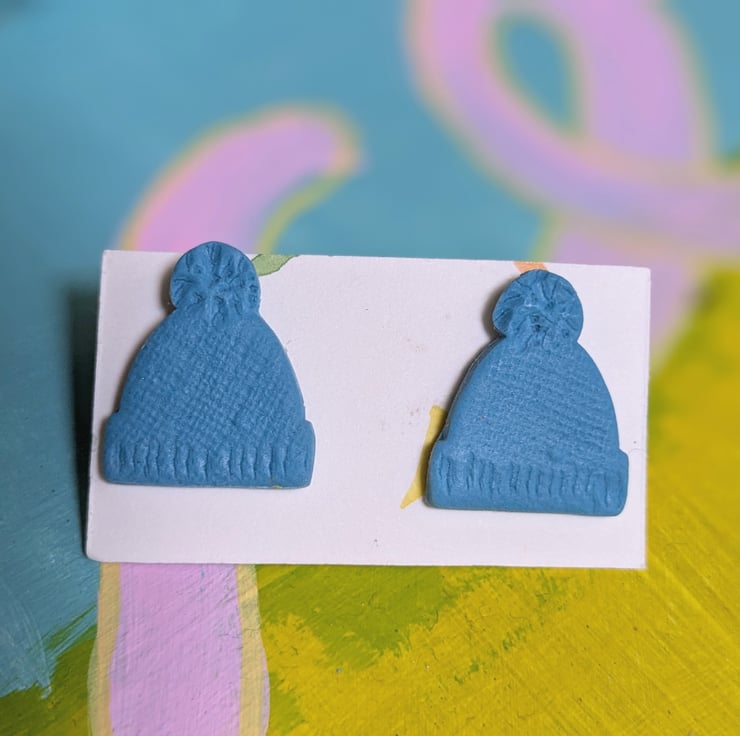 Statement polymer clay stud earrings. A fun, wintery but not overly festive bobble-hat shape in blue with added texture.