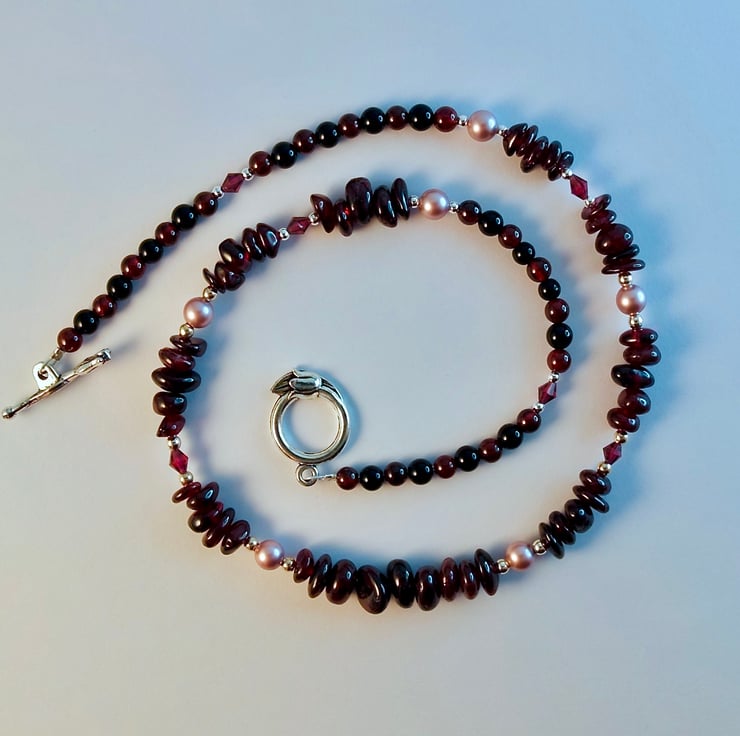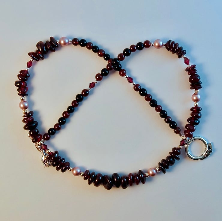 Clusters of dark red pyrope Garnet nuggets are separated by 5mm quality Austrian glass Pearls in a colour called 'powder rose' highlighted with 2mm sterling silver spacer beads, alternating with 4.5mm AA grade Rhodolite Garnet bicone