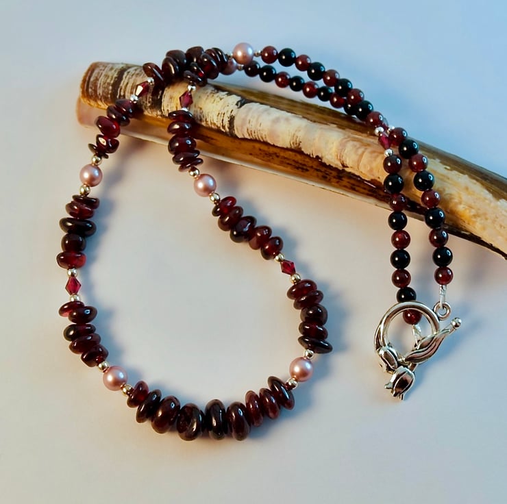 The necklace graduates to 4mmGarnet and black Onyx round beads and fastens with a Tibetan silver toggle clasp in the shape of a tulip.