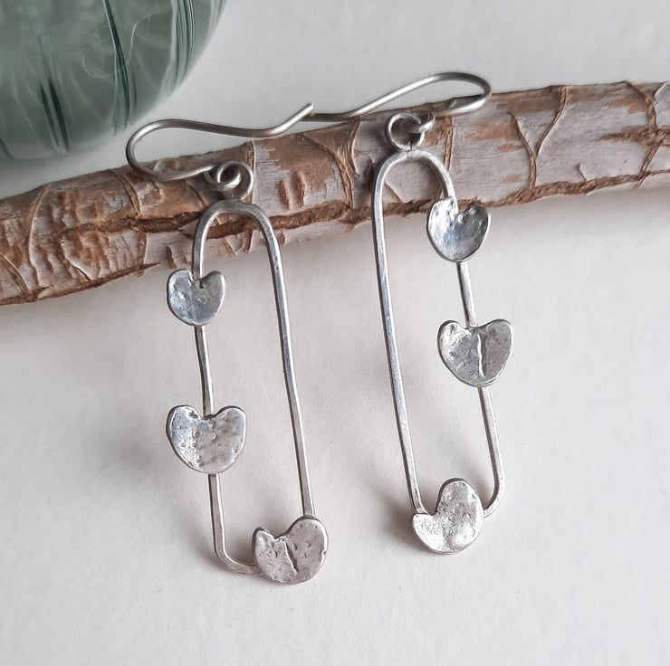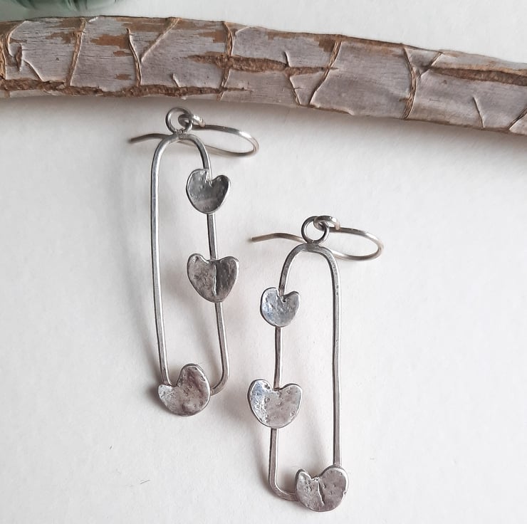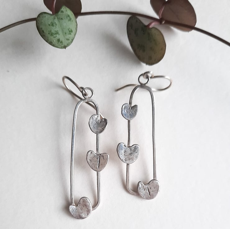 My house is full of plants and the idea for these earrings came from my String of Hearts plant. I've made individual leaves with tiny indentations which have been soldered on to a triangular frame.