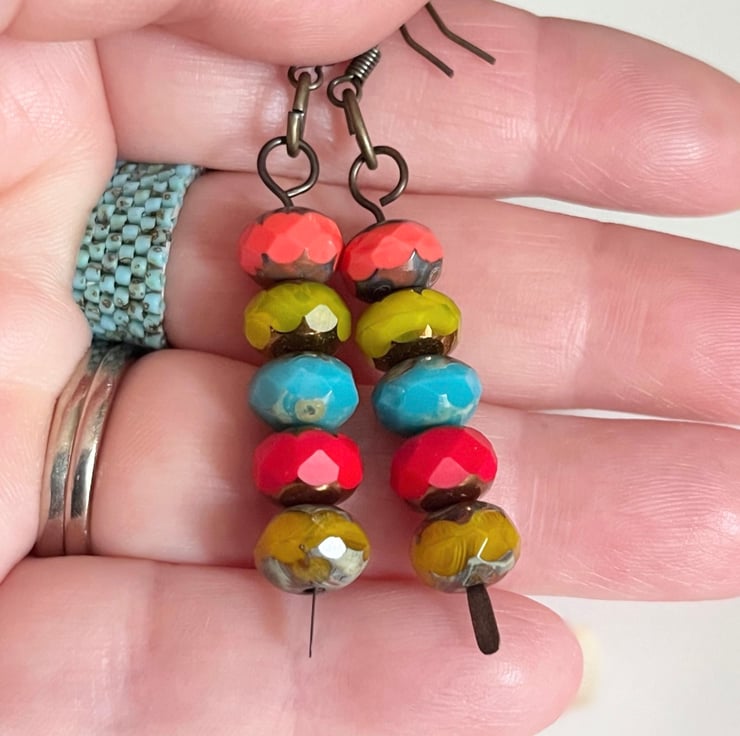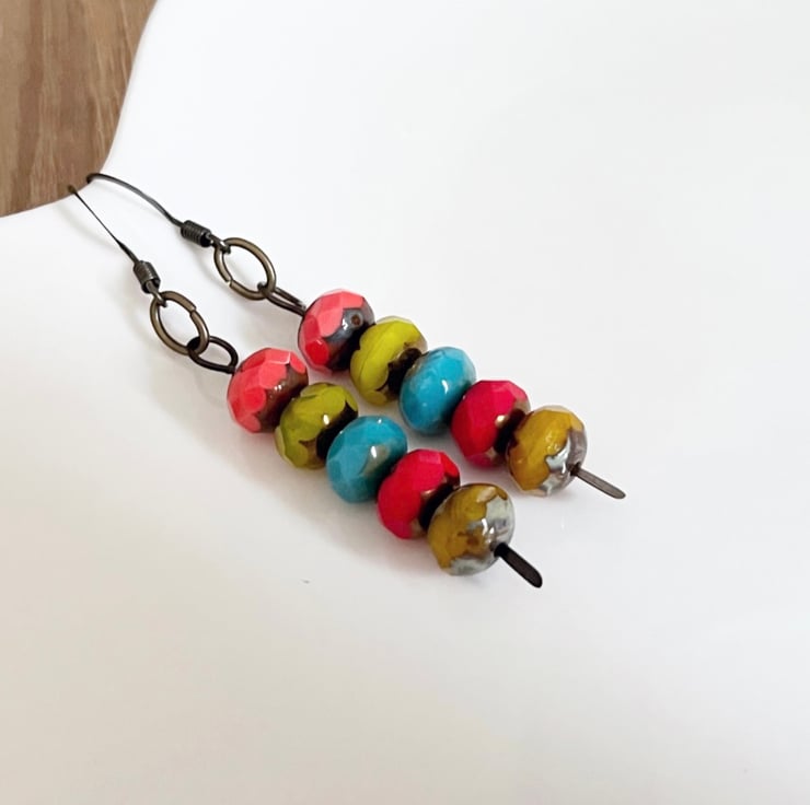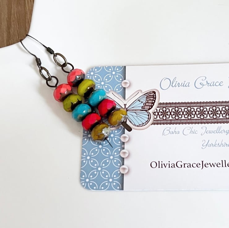 These bright colourful boho style earrings have been handmade with 8mm fire polished Czech glass beads.