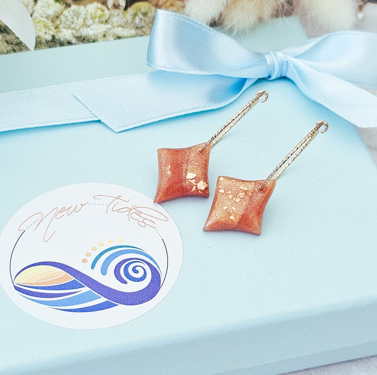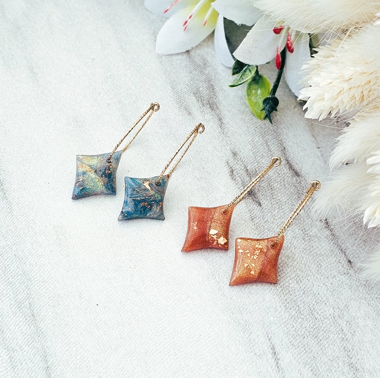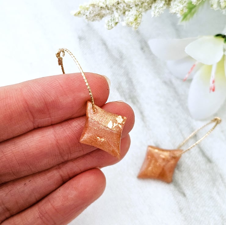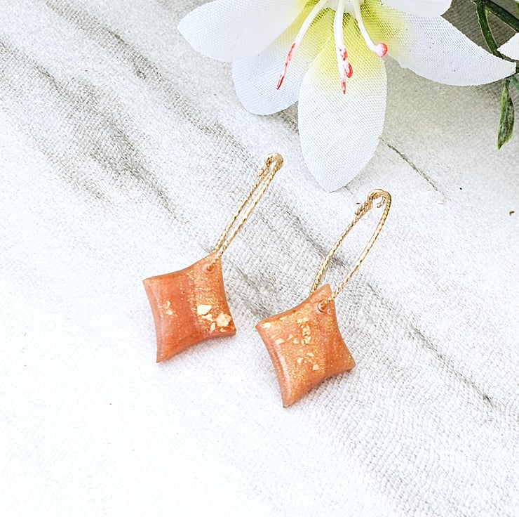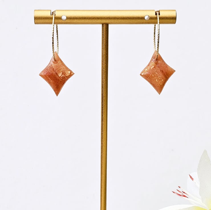 Simply and stylish hoop earrings featuring a diamond-shape polymer charm in tones of rose, pink and gold.