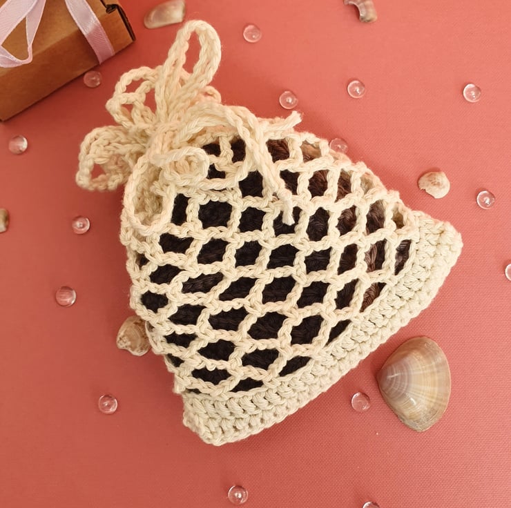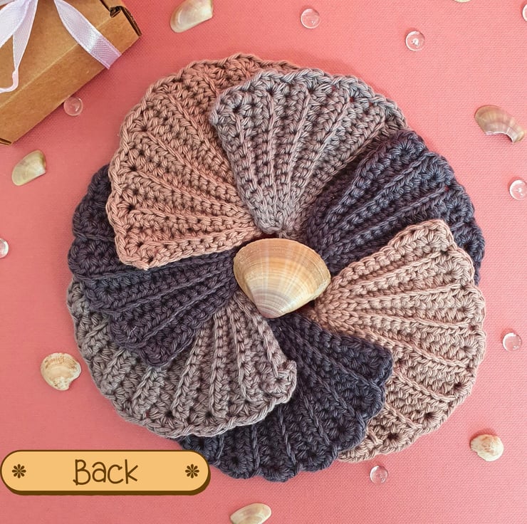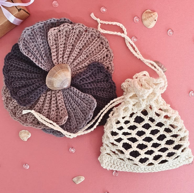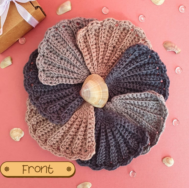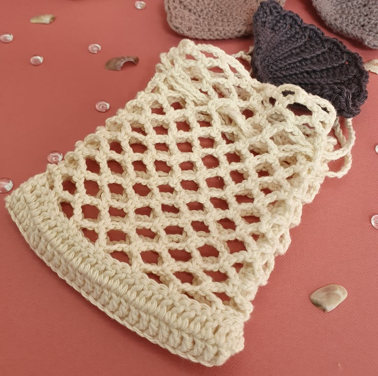 Both the face wipes & the wash bag are hand crocheted with 100% cotton yarn. The set compromises of 1 wash bag in off-white & 7 wipes, out of which 2 are in light grey, 3 in dark grey & 2 in latte brown. They are in the shape of a seashell and they measure approx. 10x7cm (widest points). They can be used with your usual cleanser or water to remove make-up. Rinse them after use, shape & lay them flat to air-dry & reuse them. Wash them regularly in the wash bag, which can also be used to store them. The wash bag measures approx. 10.5x13.5cm.