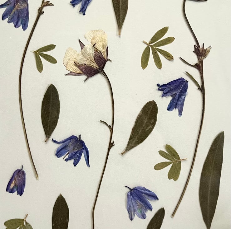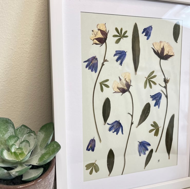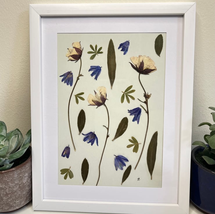 Bring nature indoors with this unique pressed flower and foliage framed art. Geums, bluebells, olive leaves and potentilla leaves all grown in our garden in Hampshire and traditionally slow pressed.