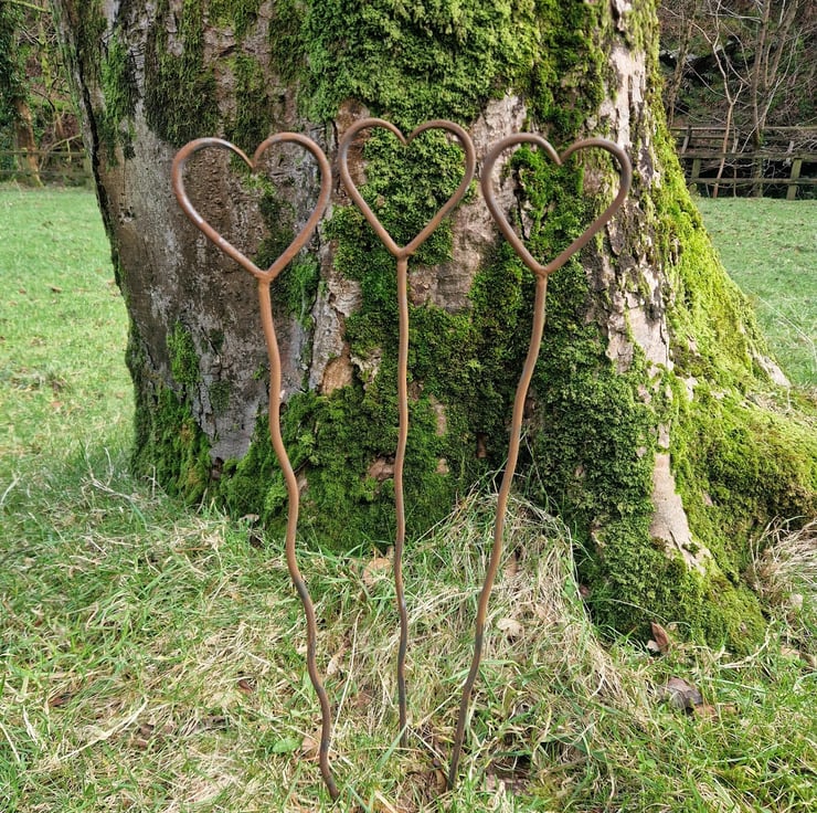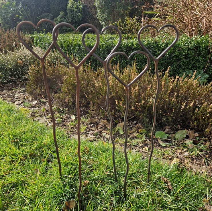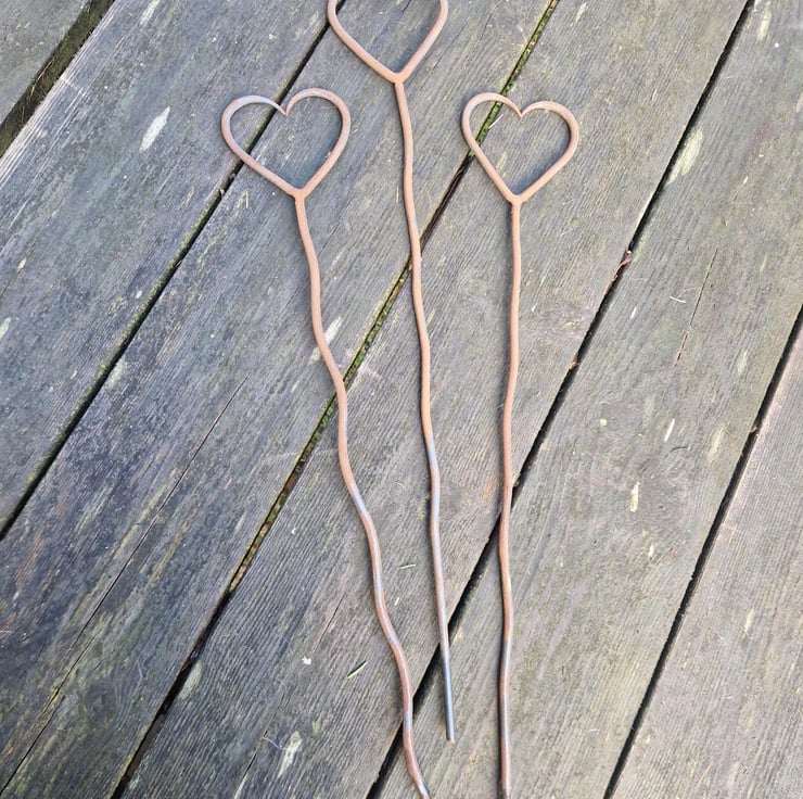Hand forged garden hearts with wiggly stems! Can be used as a plant support or simply for decoration.