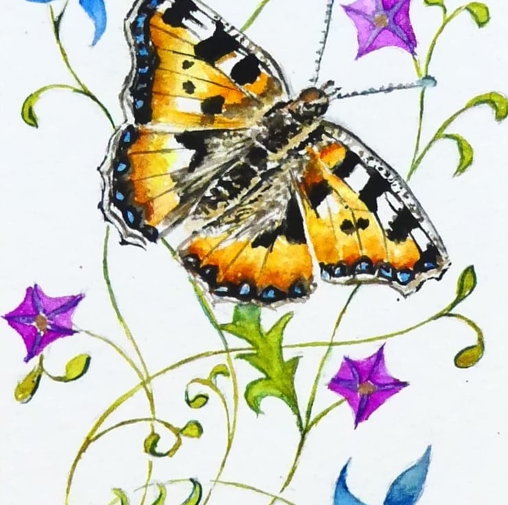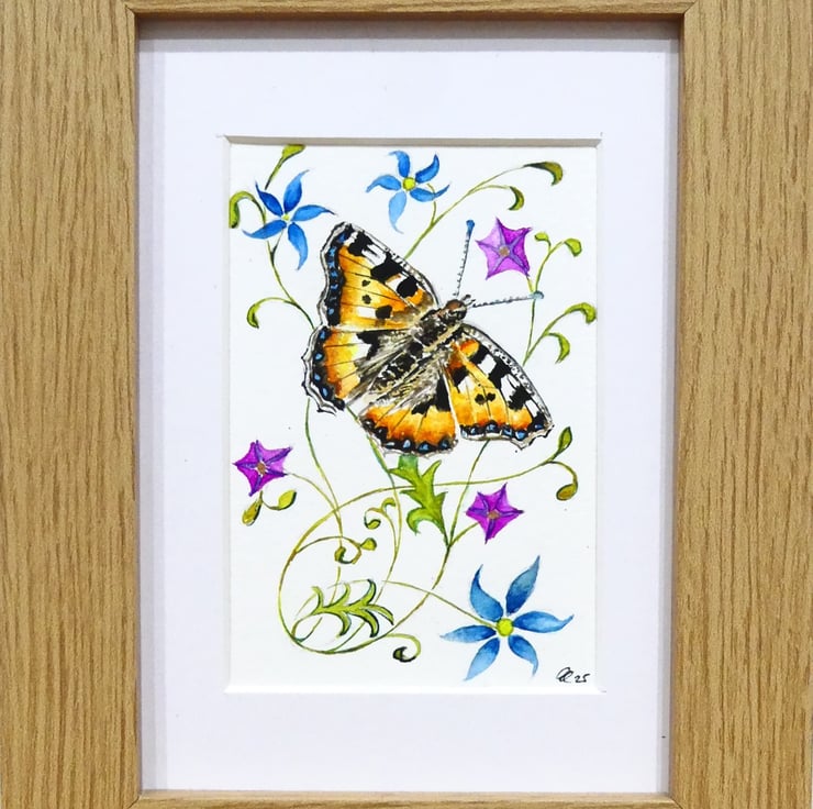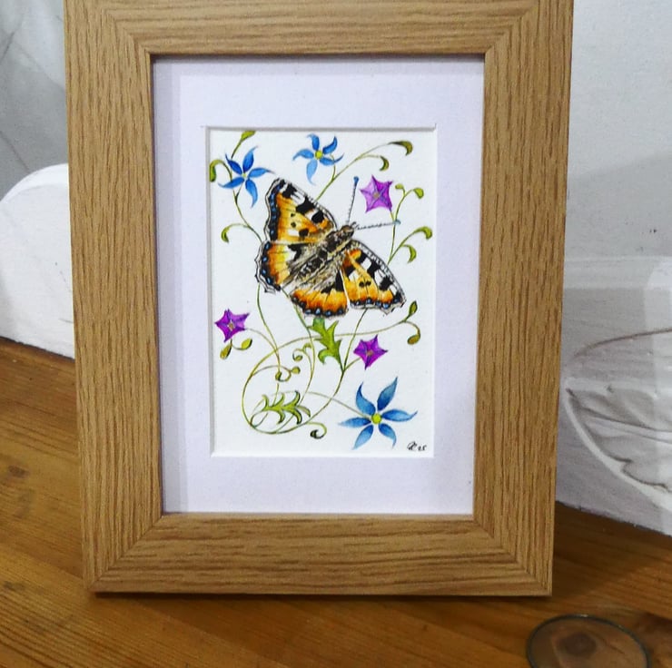 A small framed watercolor painting featuring a delicate tortoiseshell butterfly amongst stylized decorative flowers. Signed on the front, this piece measures 3.25 x 4.75 inches and comes beautifully presented in a 6.75 x 8.75-inch wood-effect frame.