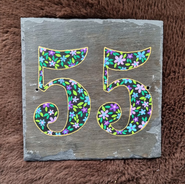 This charming slate house number sign features a hand painted, intricate purple and blue floral design.