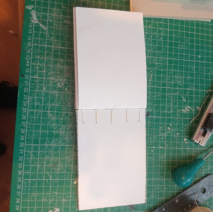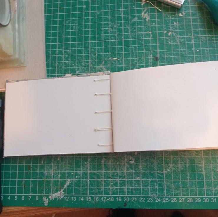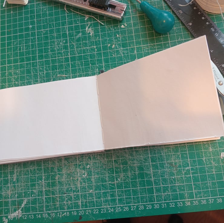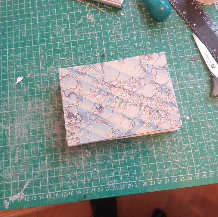 Watercolour sketchbook made with hand-cut indian cotton watercolour paper, bound with an open spine coptic stitch using linen thread, greyboard and printed marbled paper to make this sketchbook.