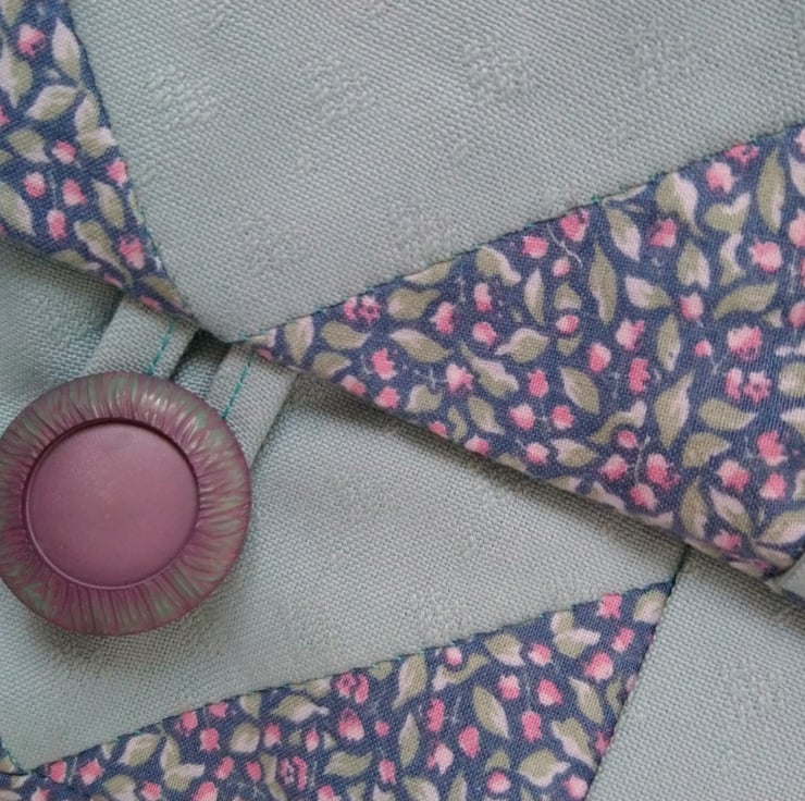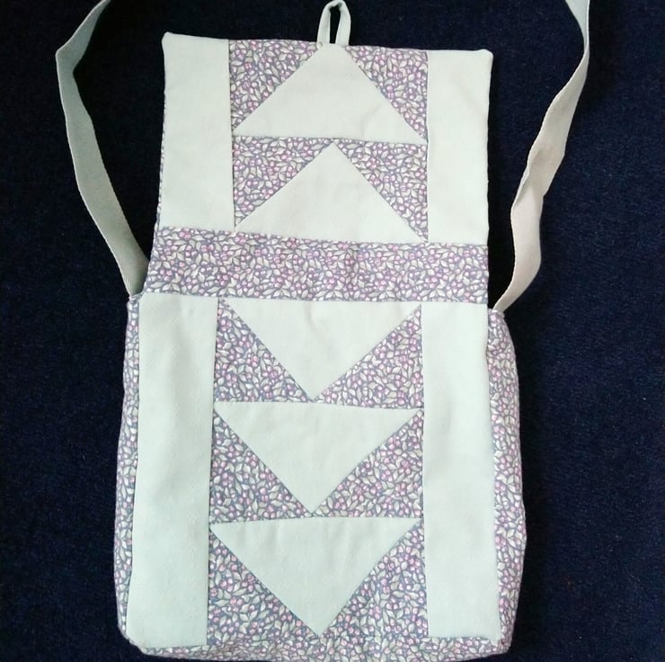 Lined in pastel cotton with pockets for things like hair brush, phone, comb, pens etc. The flap is lined in the floral fabric.