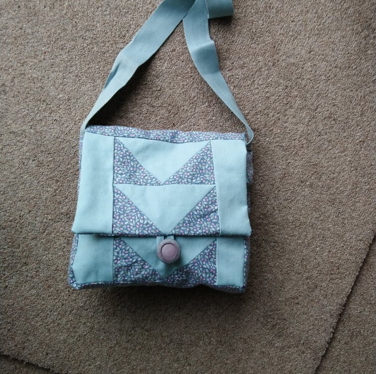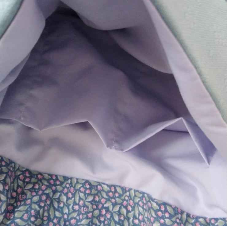 Hand sewn patchwork bag using two fabrics, a plain duck egg / teal with a slightly raised self coloured pattern, and a pretty floral in shades of blue and duck egg with a little pink.