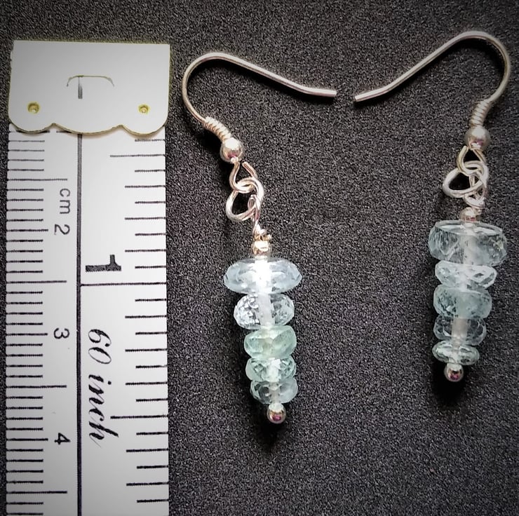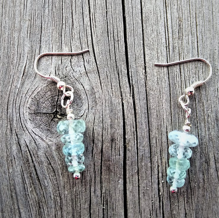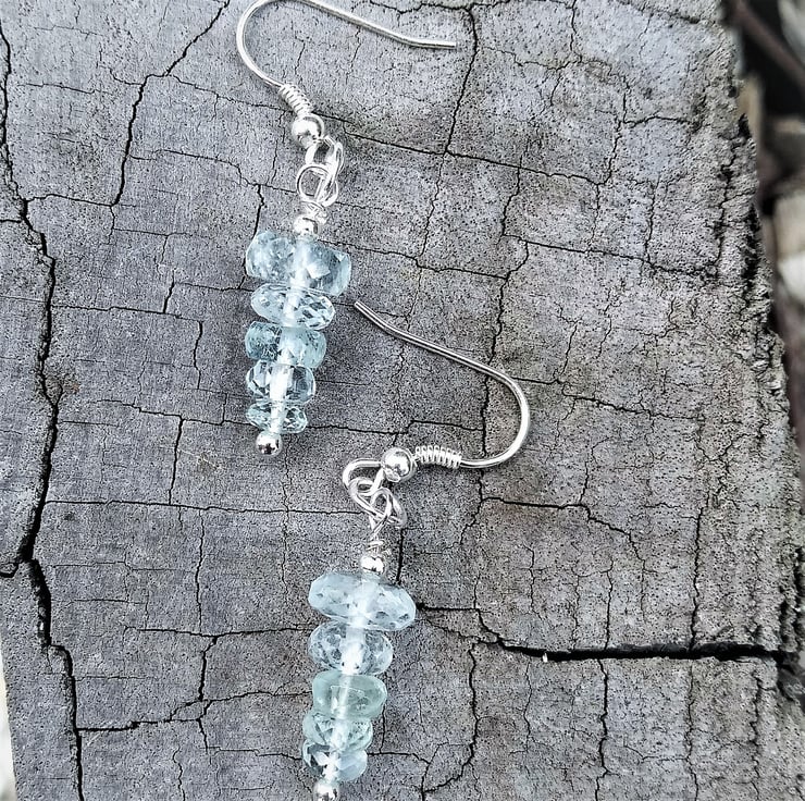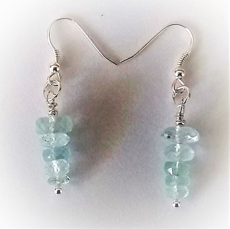 Genuine natural faceted Aquamarine rondelles, sizes 3 x 1mm to 6 x 2mm, from Africa, on a simple 925 Sterling Silver wire and shepherd hook ear fitting. The dangle length is approx 3.5cm (nearly 1.5 inch) approx. They have a beautiful subtle hint of blue, they have not been enhanced, ideal for a bride looking for that something blue or as a birthday gift during March. Aquamarine is also given for a 19th Wedding Anniversary, Drop length 3.5cm approx.