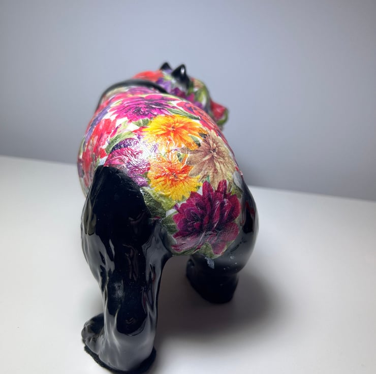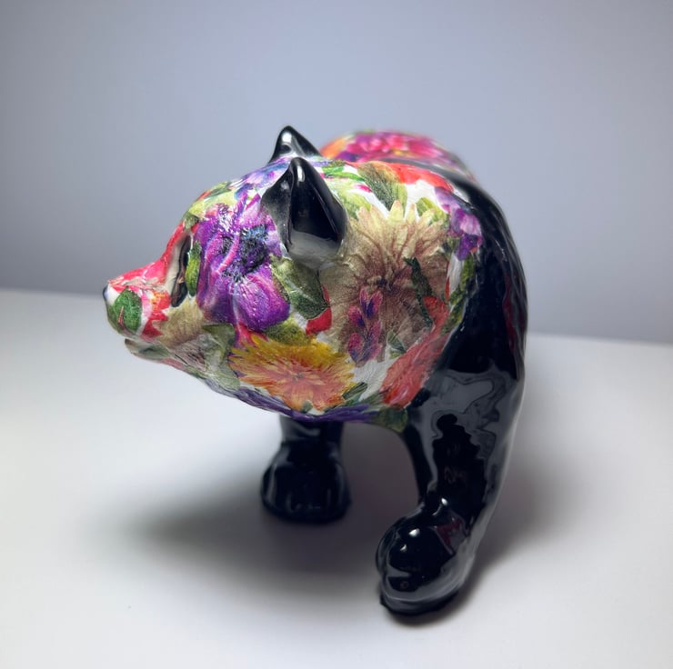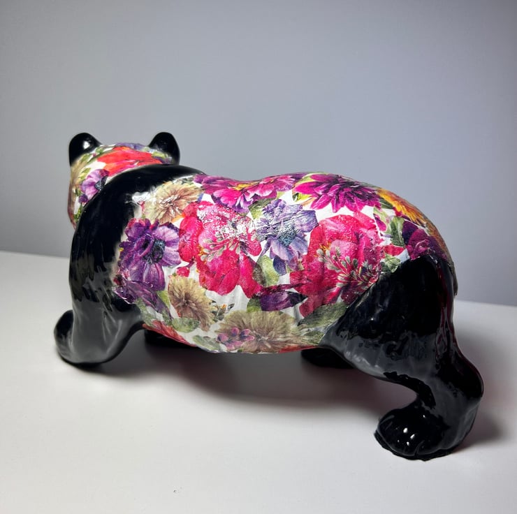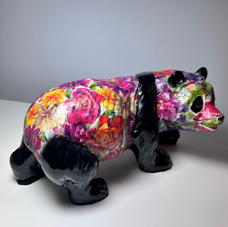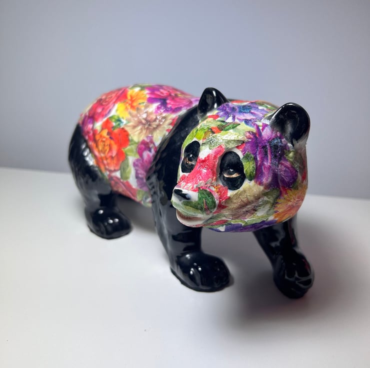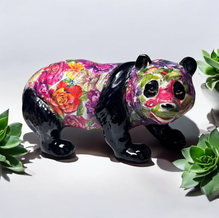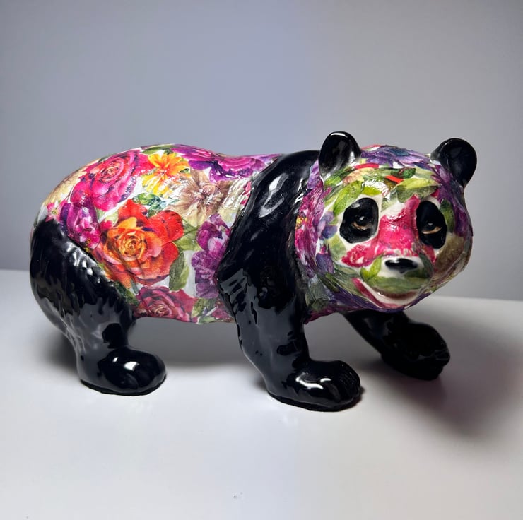 Hand decorated ceramic panda with flowers this is finished with a top coat of clear glossy varnish.