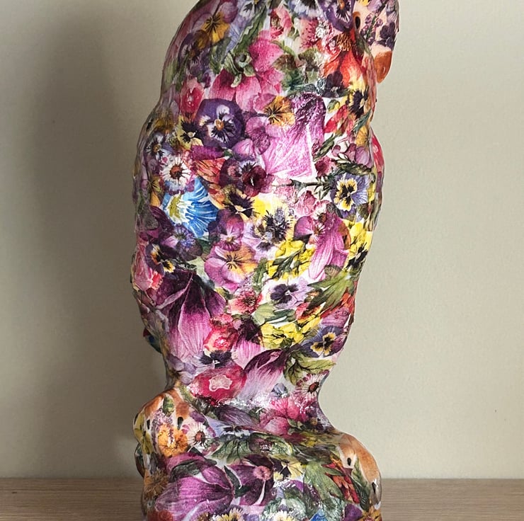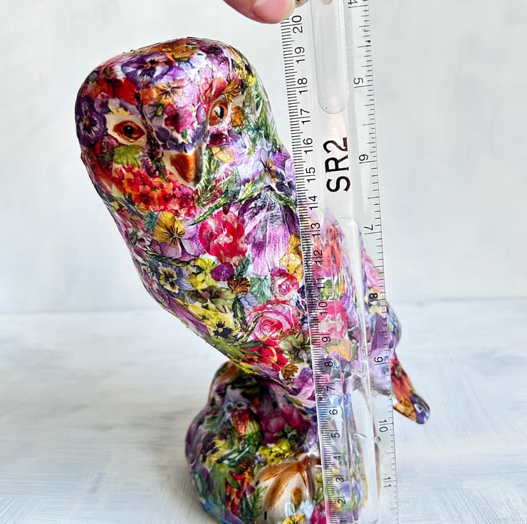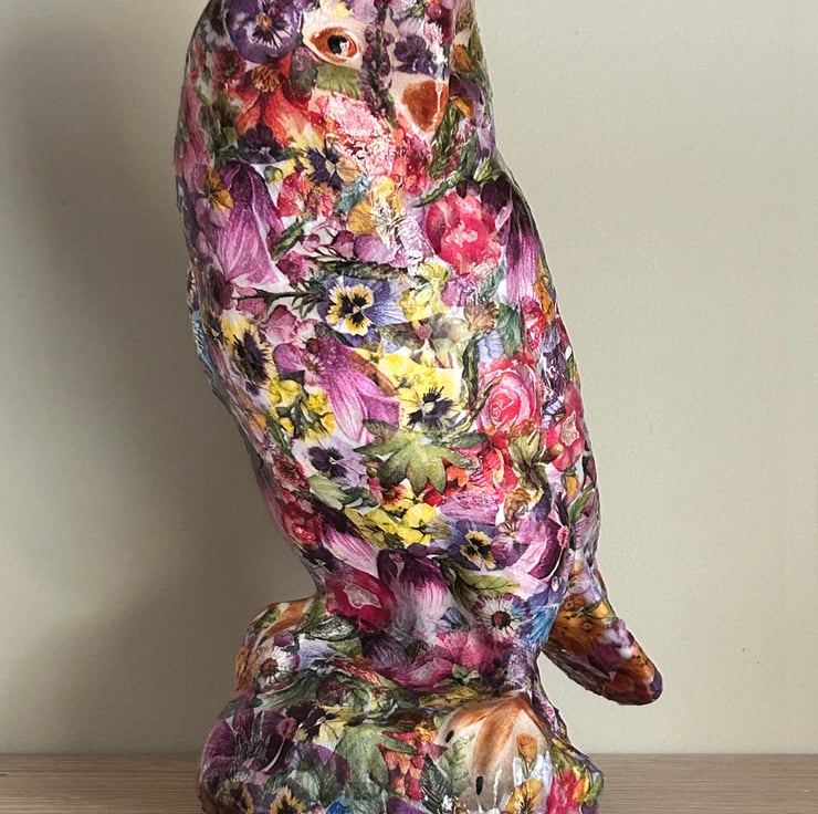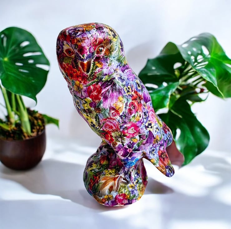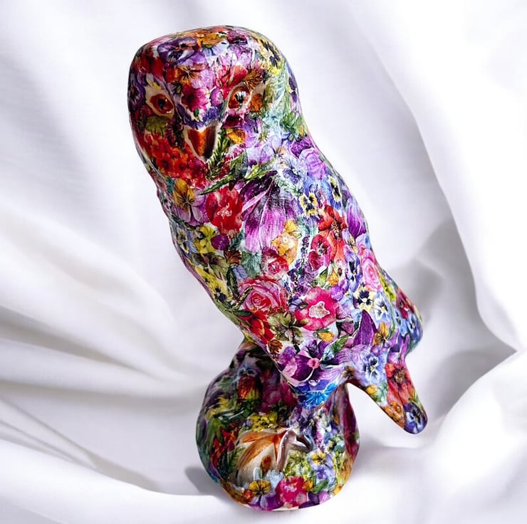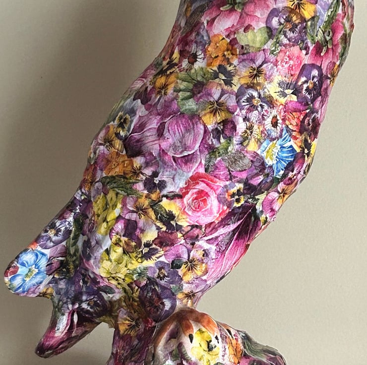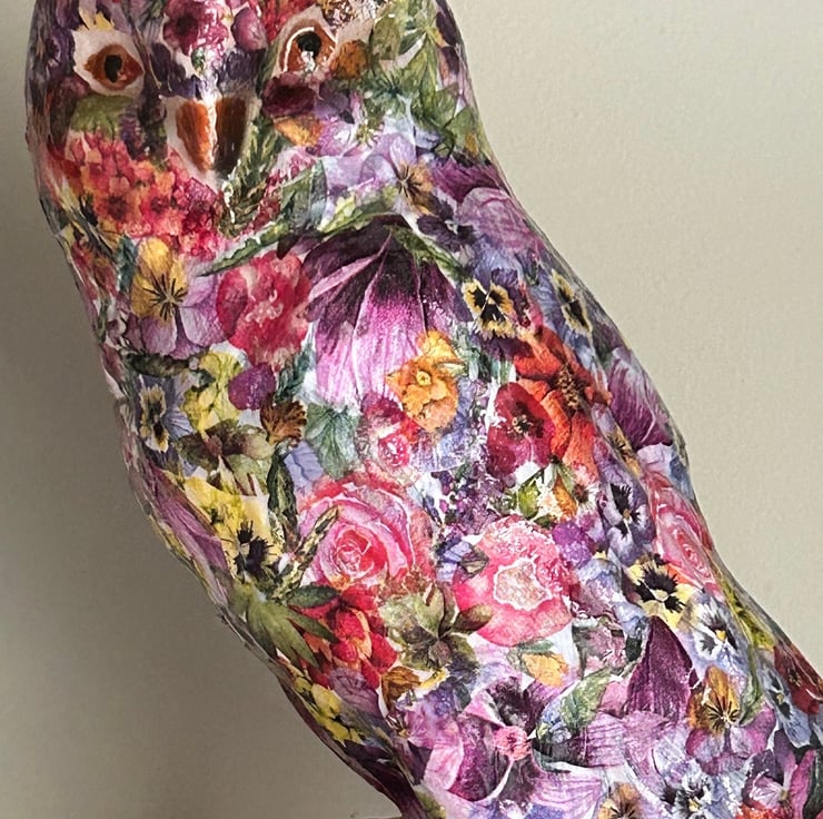 Each paper flower has been painstakingly cut out and individually stuck onto the owl which is finished with several layers of gloss varnish to create the stunning effect.