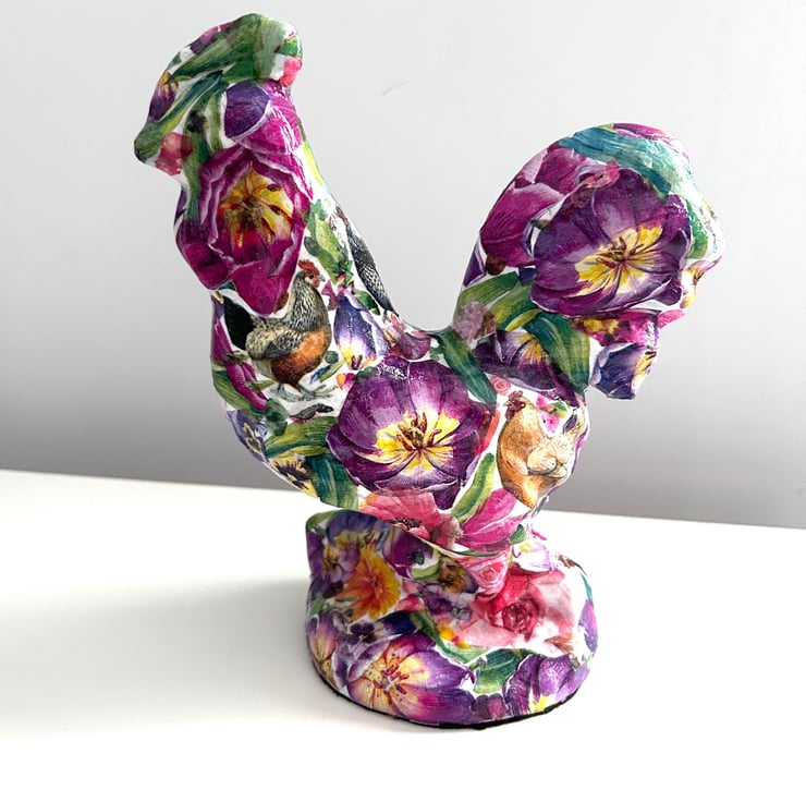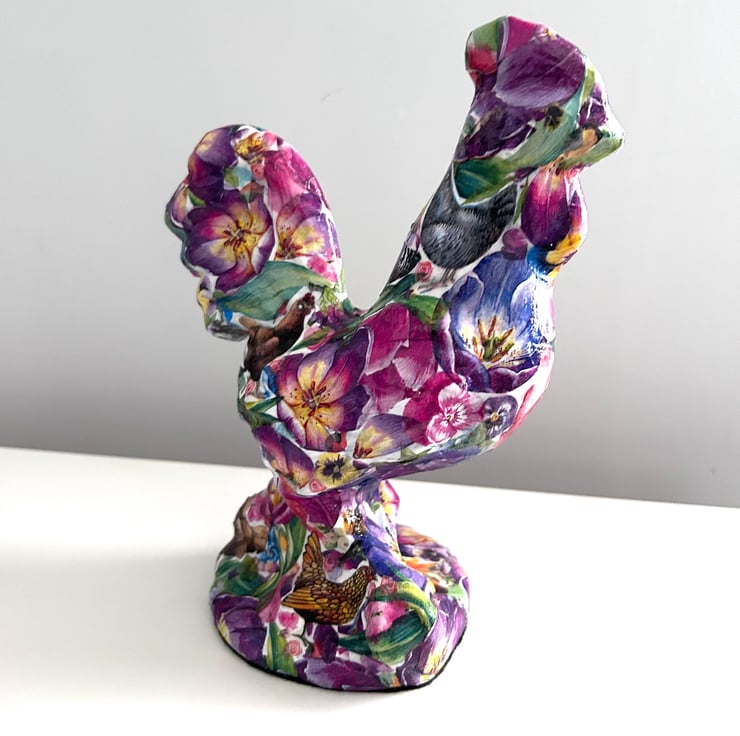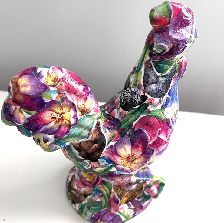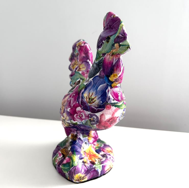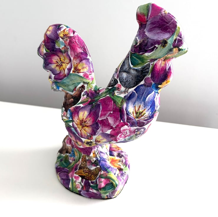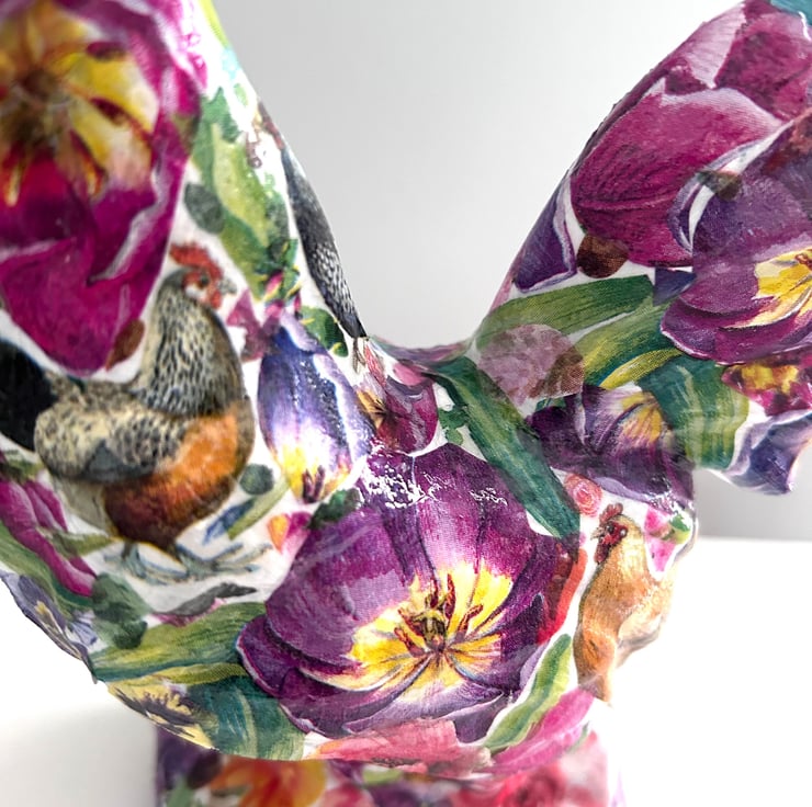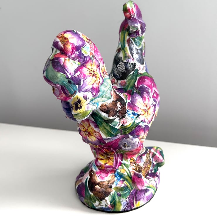 I really enjoy creating these decoupaged animals. Each flower is individually added to the ceramic animal item in layers to create the finished effect.