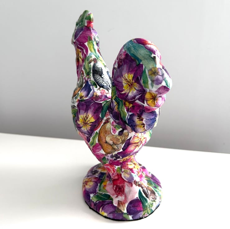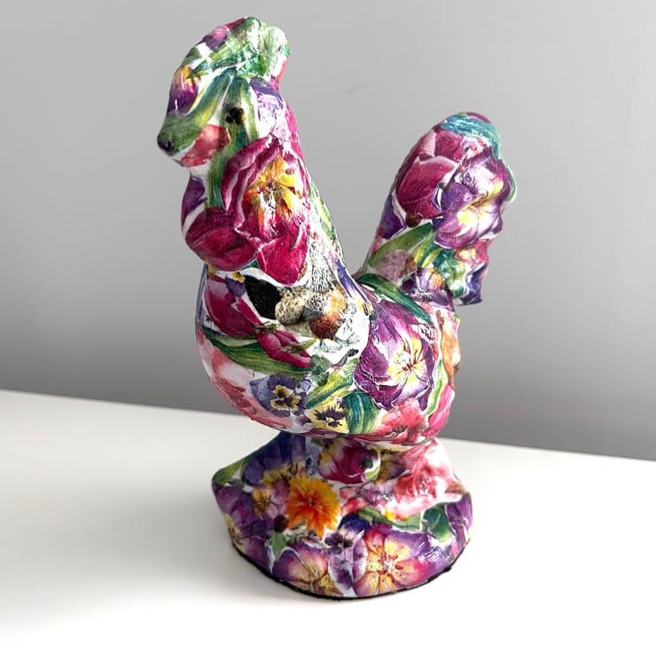 Hand decorated in a pop art style with flowers this ornament is finished with a top coat of clear glossy varnish. In amongst the flowers this rooster has images of chickens within the pattern.