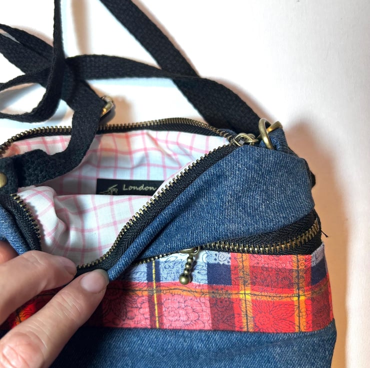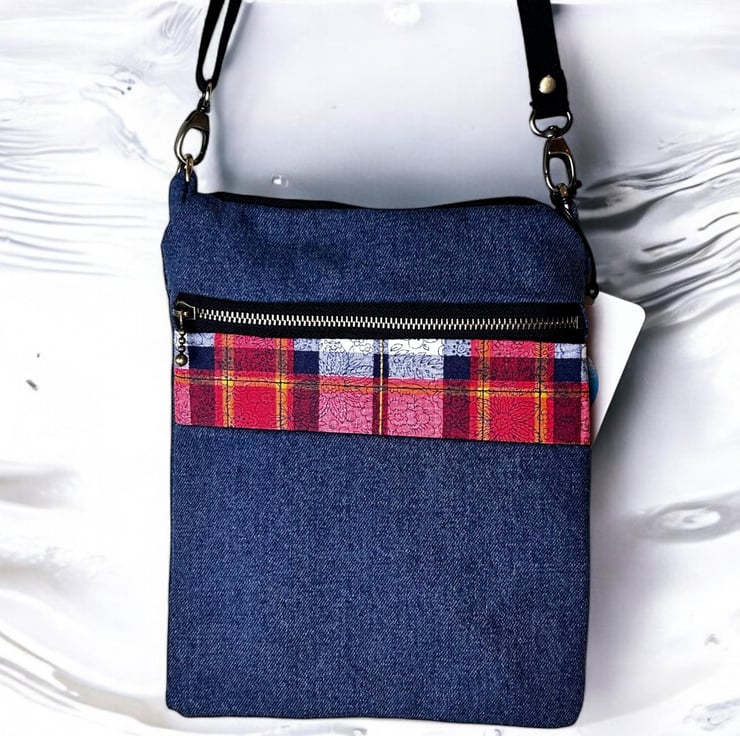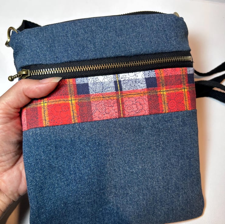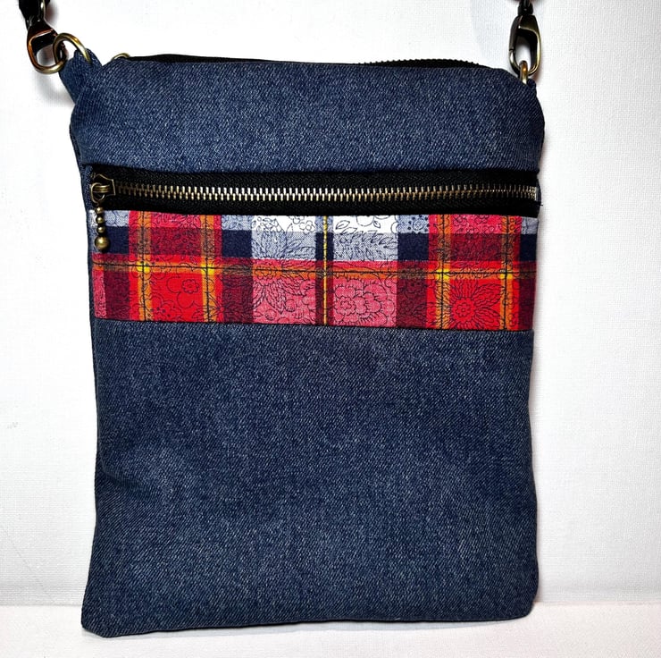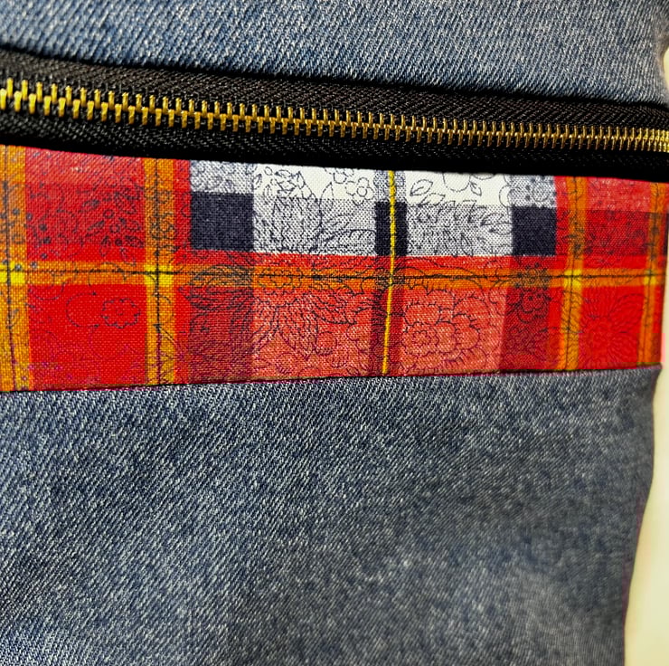 Upcycled denim bag with contrasting red checked fabric. The bag is handmade using upcycled denim to create a unique gift.