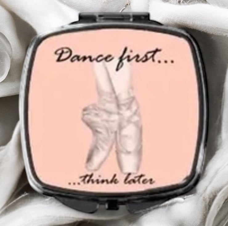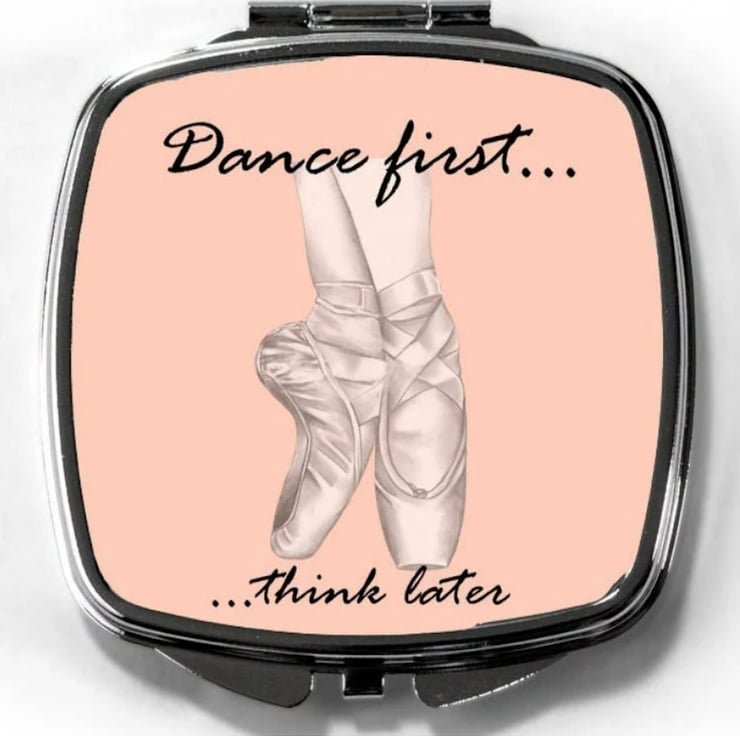 Dancers compact gift with inspirational quote has been designed using the peachy pink colour of satin ballet shoes this compact mirror is a useful accessory - girls ballet gift handbag mirror for ballerinas and dancers.