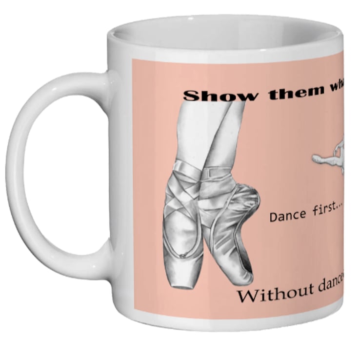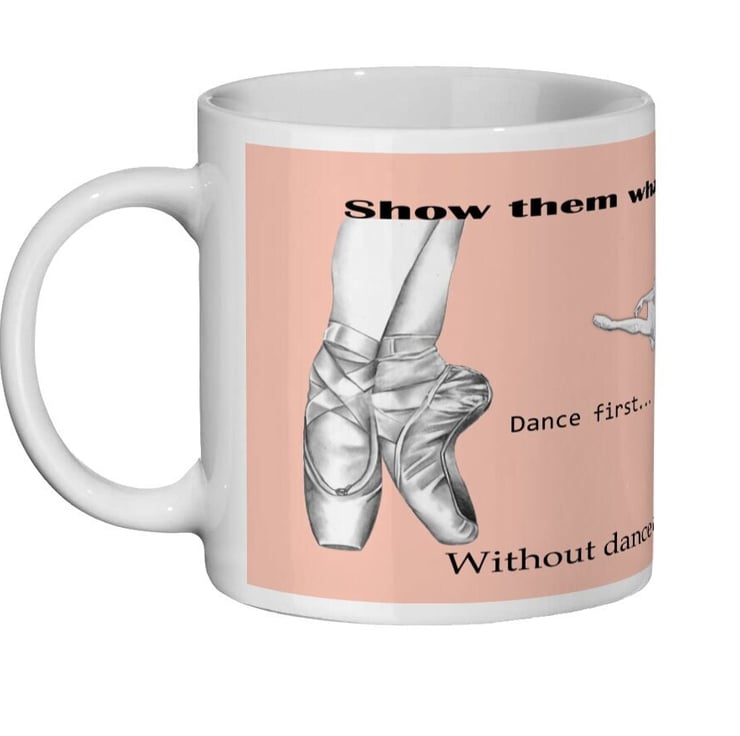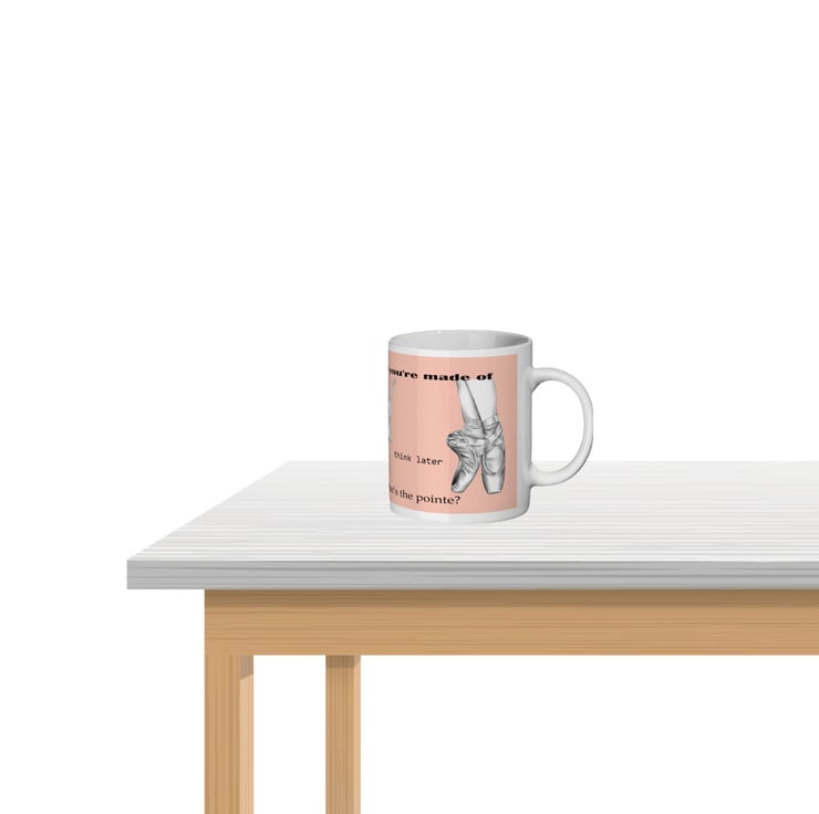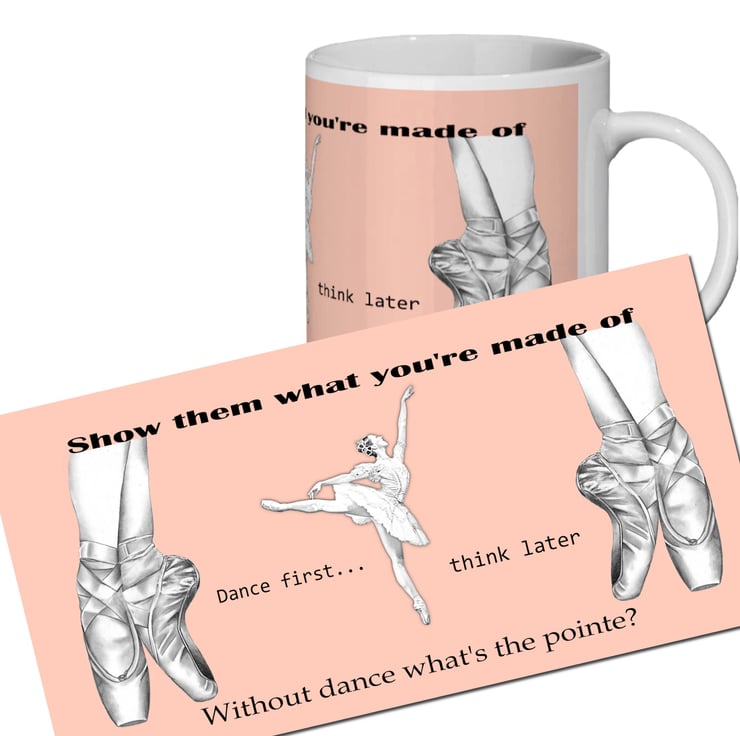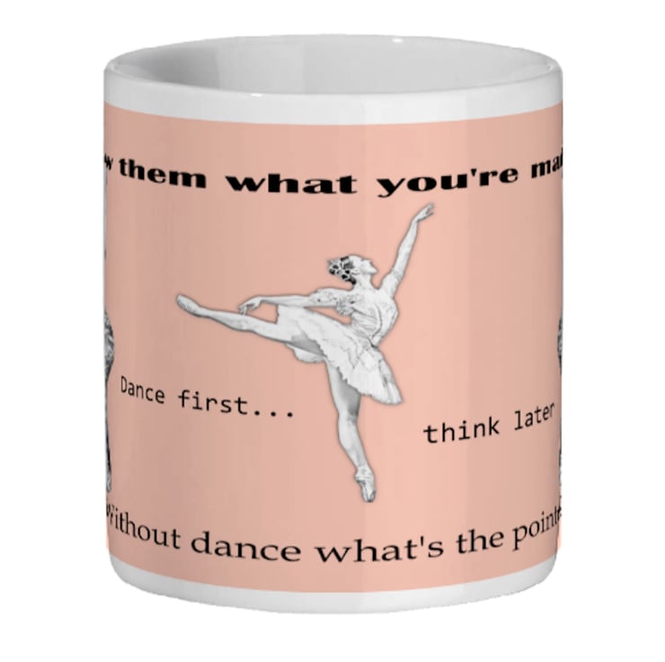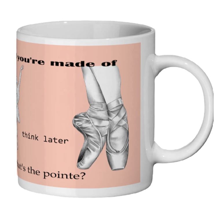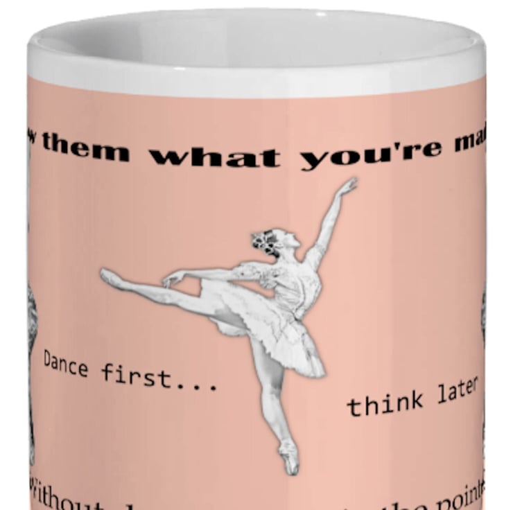 Ballet themed ceramic mug with funny and positive slogans for ballerinas. Coffee mug with a fun theme great for dancers of any age.