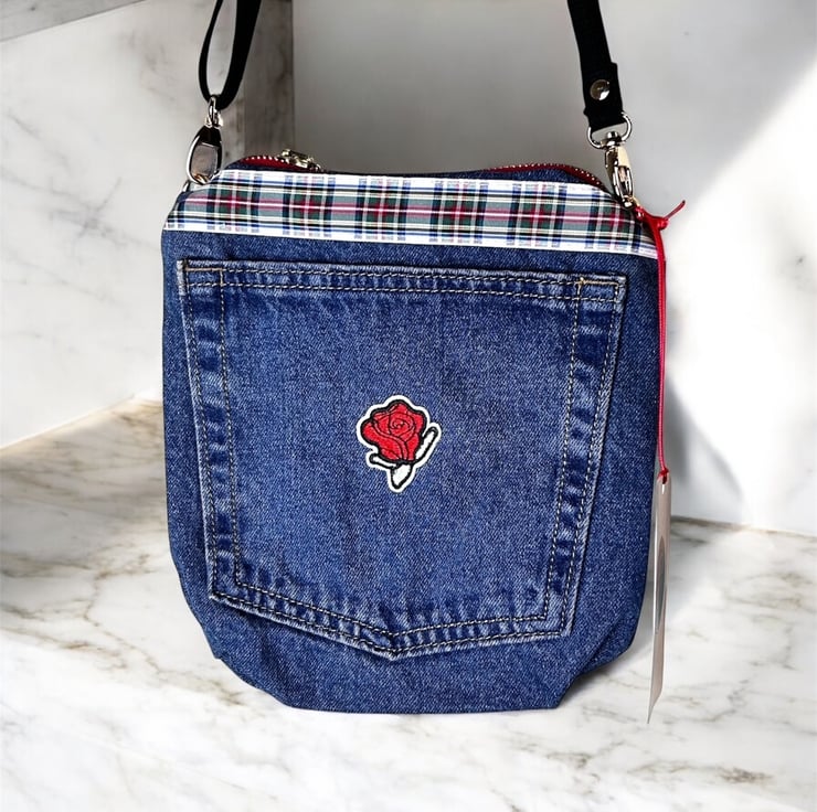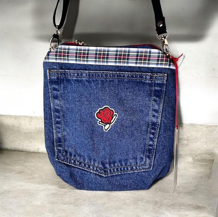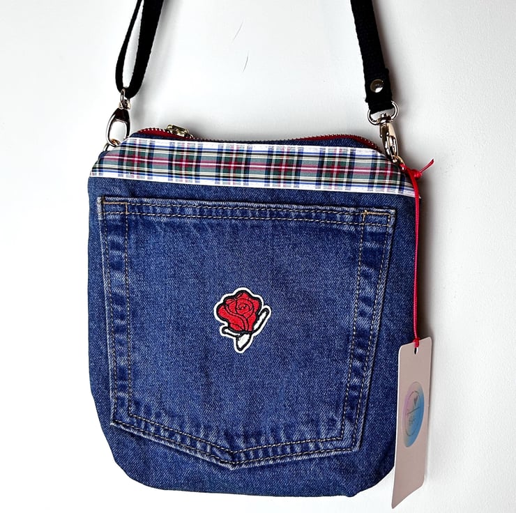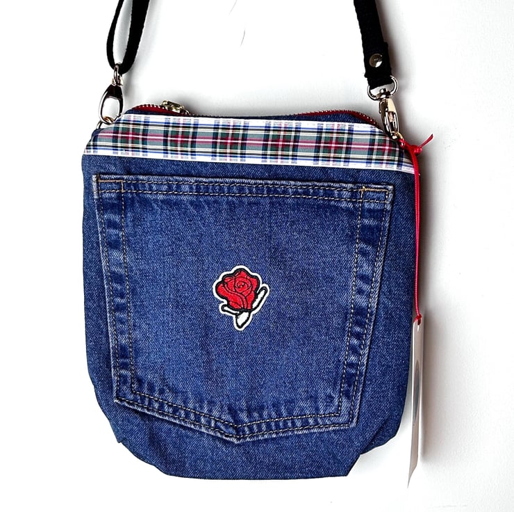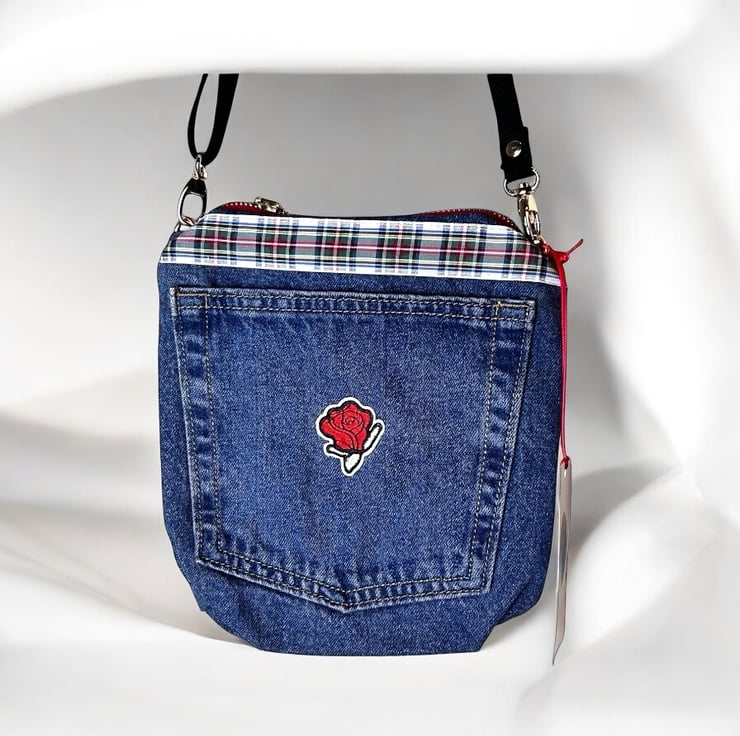 This stylish box bottomed up-cycled jeans pocket bag with outer pocket and zipped lined compartment is a useful small bag for any wardrobe. It is lined iin a sleek satin lining and topped with a red zip. The black canvas adjustable strap is practical
