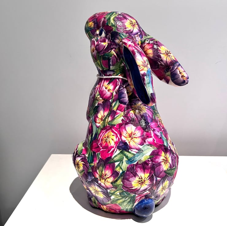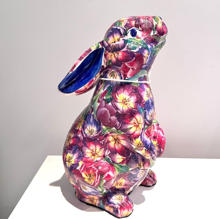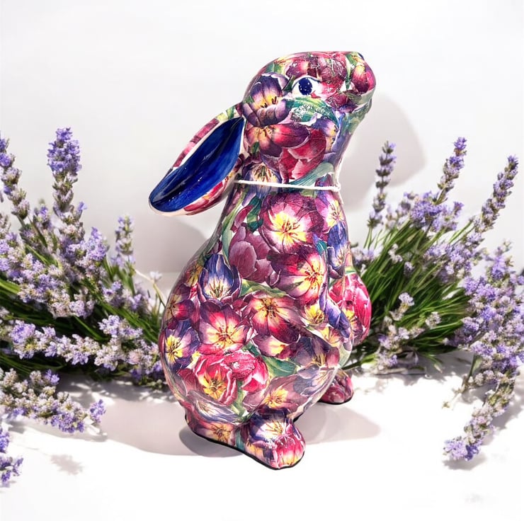 Hand decorated ceramic bunny with flowers this bunny is finished with a top coat of clear glossy varnish.