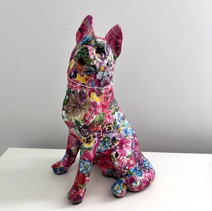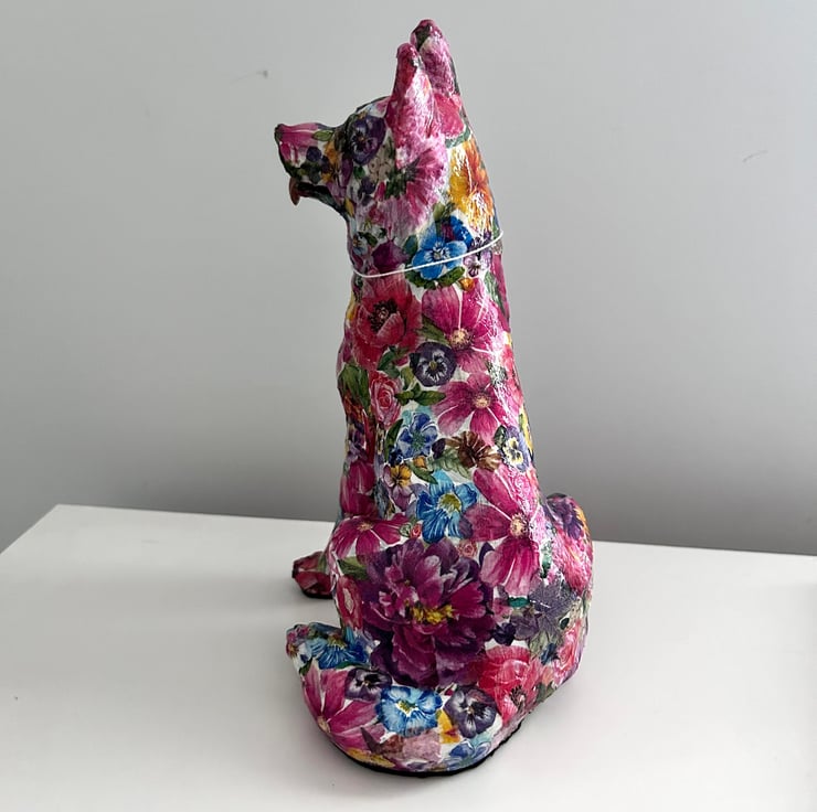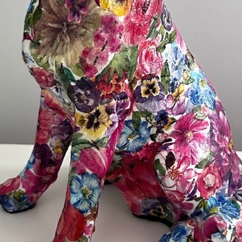 I really enjoy creating these decoupaged animals. Each flower is individually added to the Upcycled ceramic animal item in layers to create the finished effect. Rainbow colours with many flowers including pansies, daisies leaves and summer flowers.