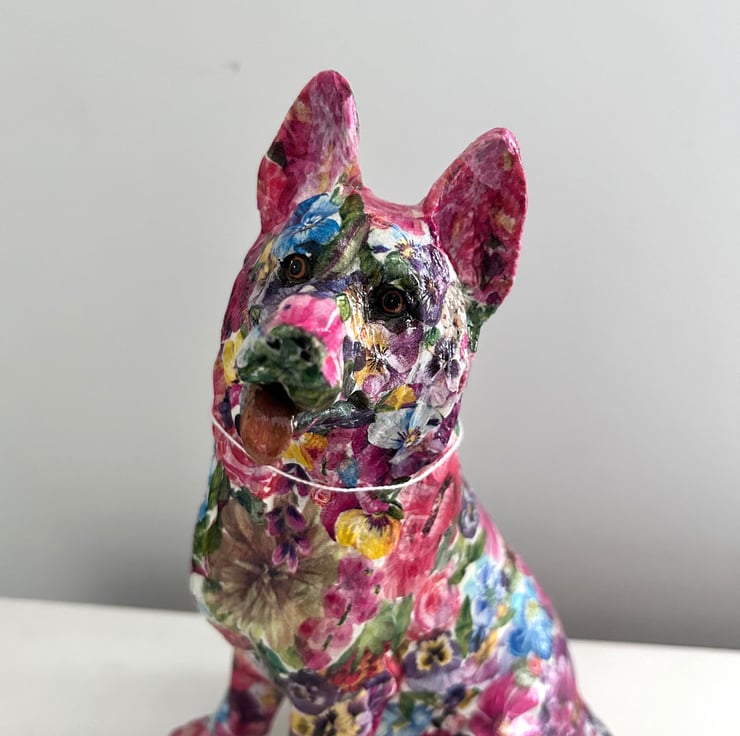 Hand decorated ceramic dog with flowers this Alsatian is finished with a top coat of clear glossy varnish.