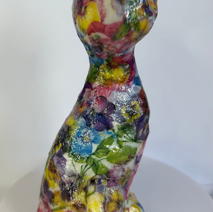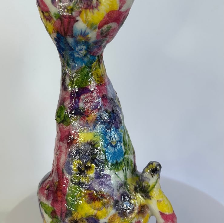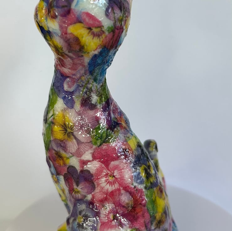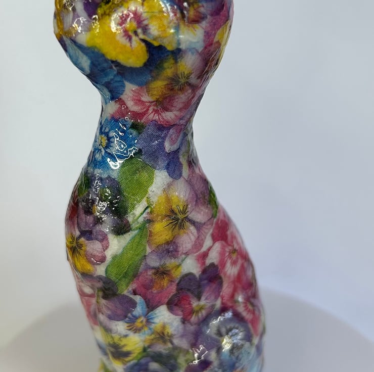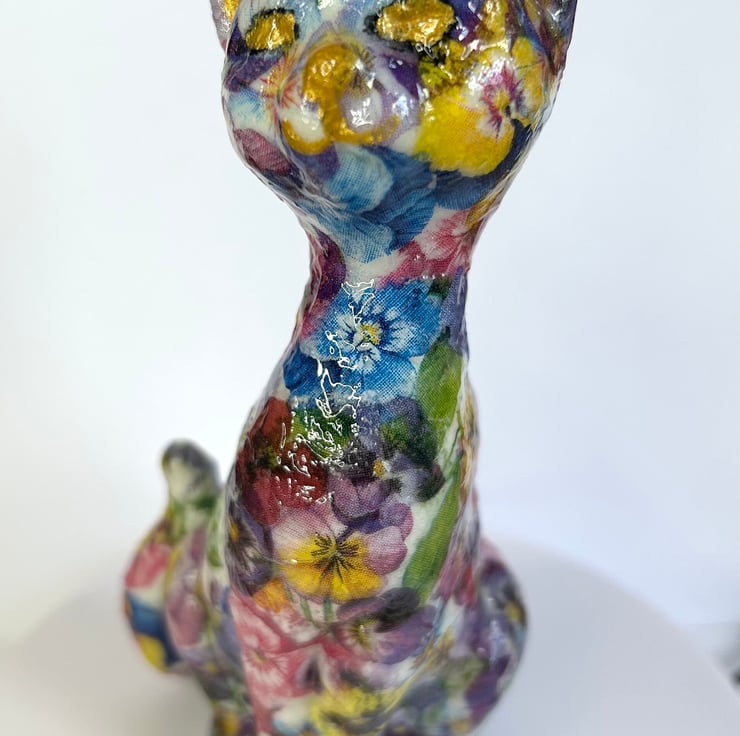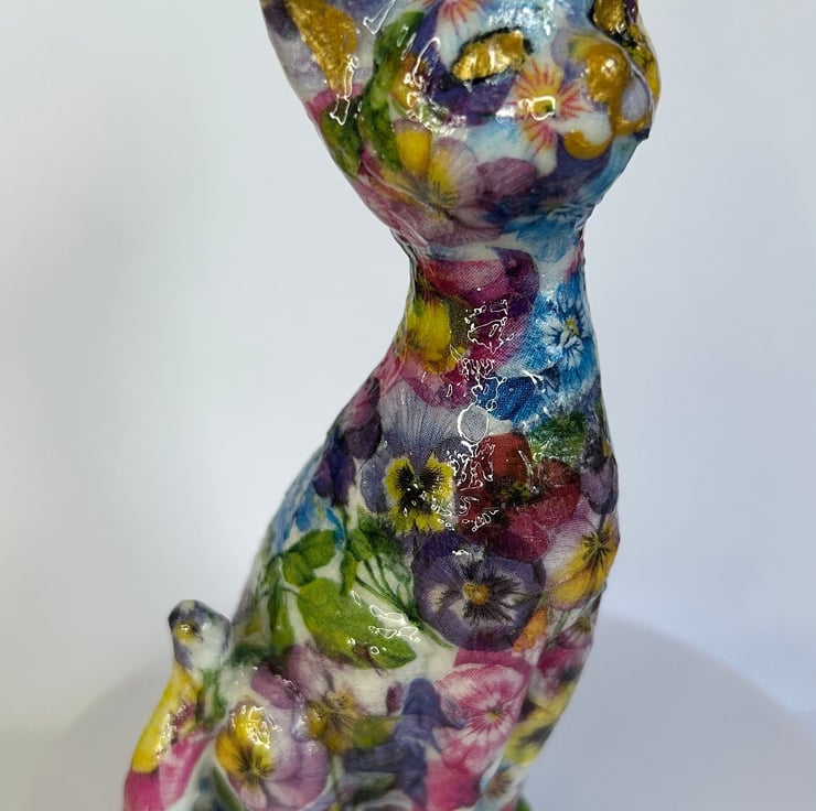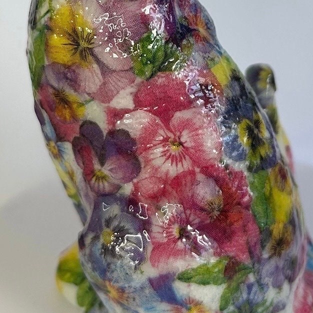 I really enjoy creating these decoupaged animals. Each flower is individually added to the item in layers to create the finished effect.