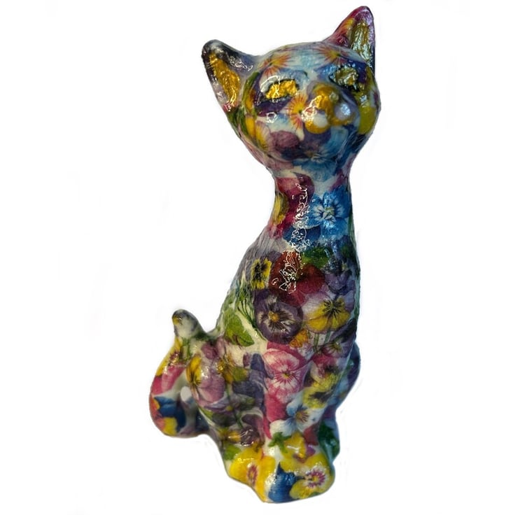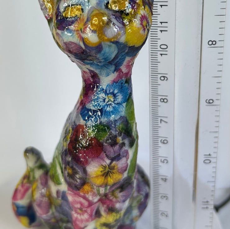 Hand decorated ceramic cat with flowers this cat has a top coat of clear glossy varnish.