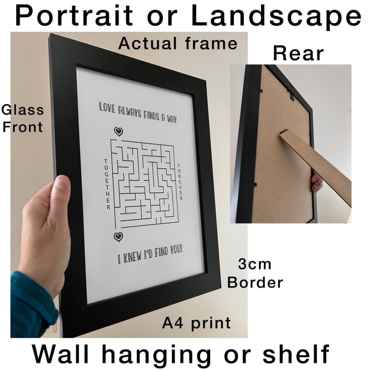 The Frame is a glass fronted with black border (see photo). Can be hung on wall or sat on shelf.
