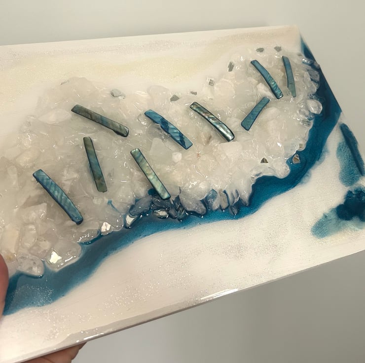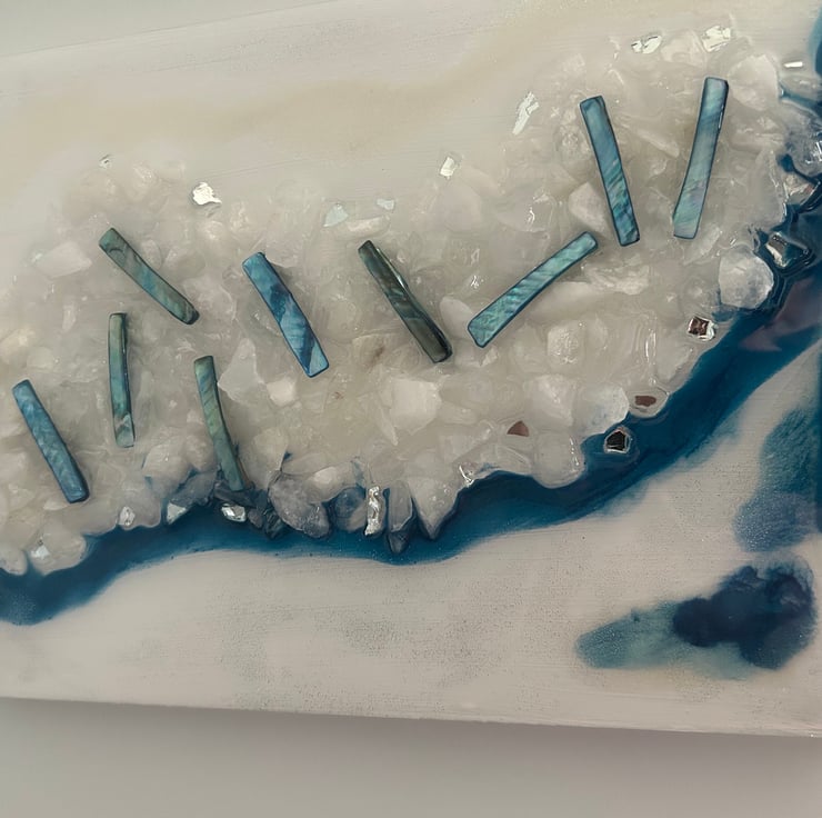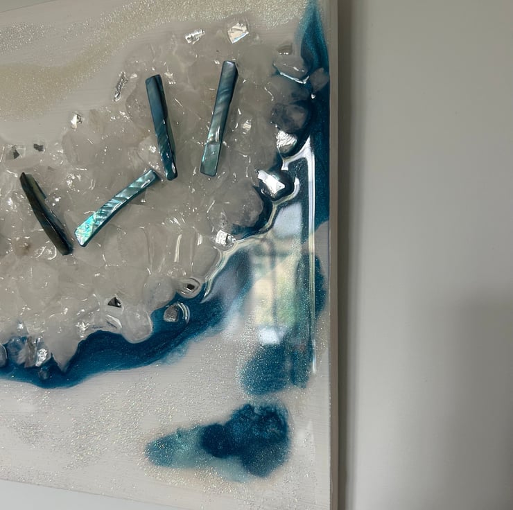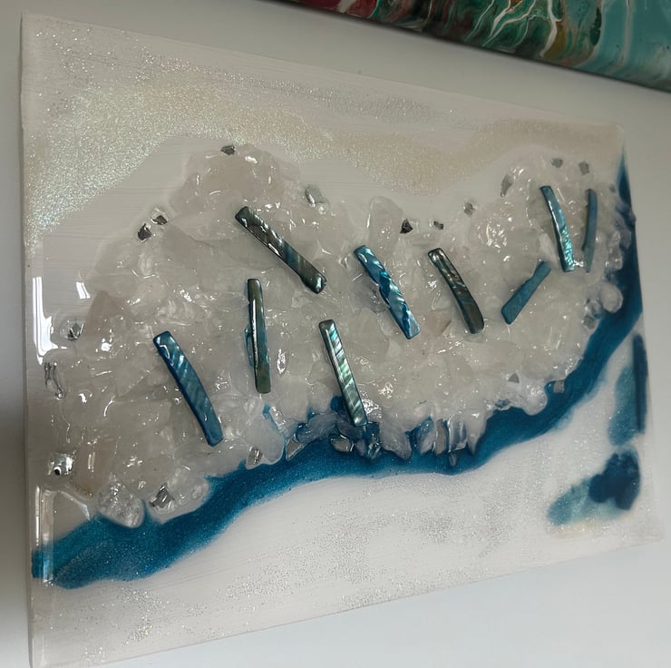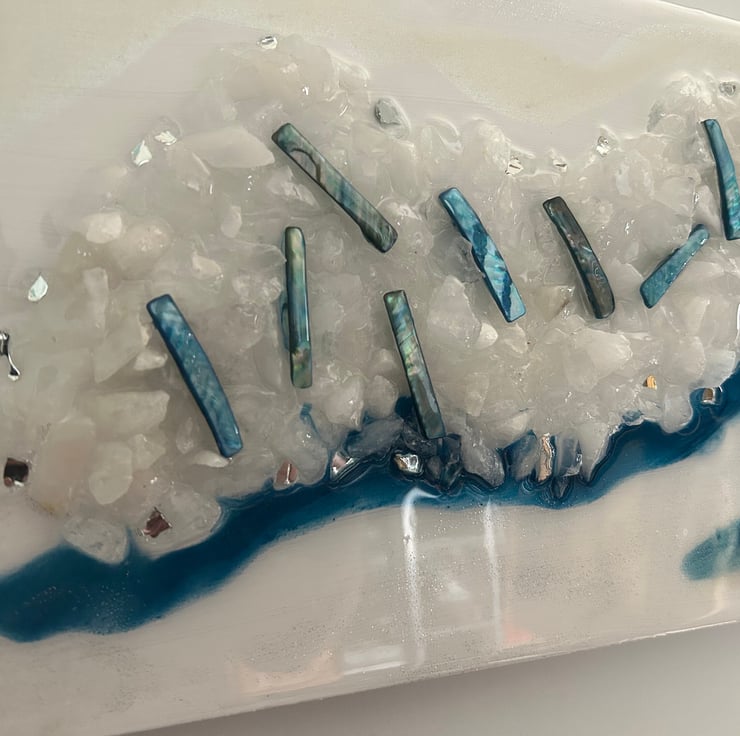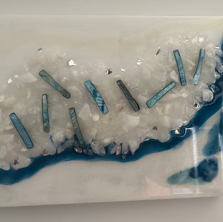 'Paua ' features white Quartz and Paua shell with sparkly glitter and mirrors held within resin to achieve the finished effect. It has a background of white with blue to complement the natural colours of the shell.