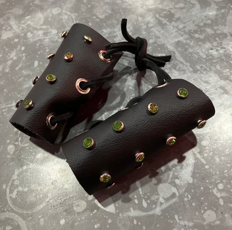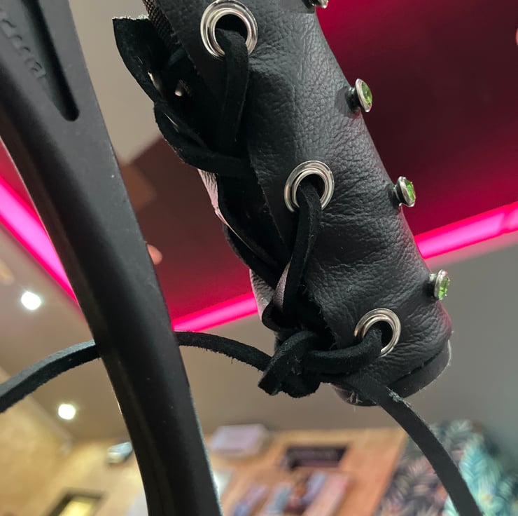 The specs on these handle decorations are quite simple. They measure 9cm X 10cm. The black leather is a soft 2.0 oz leatherweight, with 12 green gemstones riveted onto each handle (that's 24 in total). A leather lacing is given for each handle decoration. (sold as a pair)