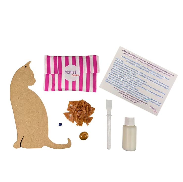 Inside each kit, you'll discover all the materials needed to bring your furry friend to life. With a pre-cut base featuring a ginger cat design, vibrant mosaic tiles, and easy-to-follow instructions, crafting your mosaic is both enjoyable and rewarding.
