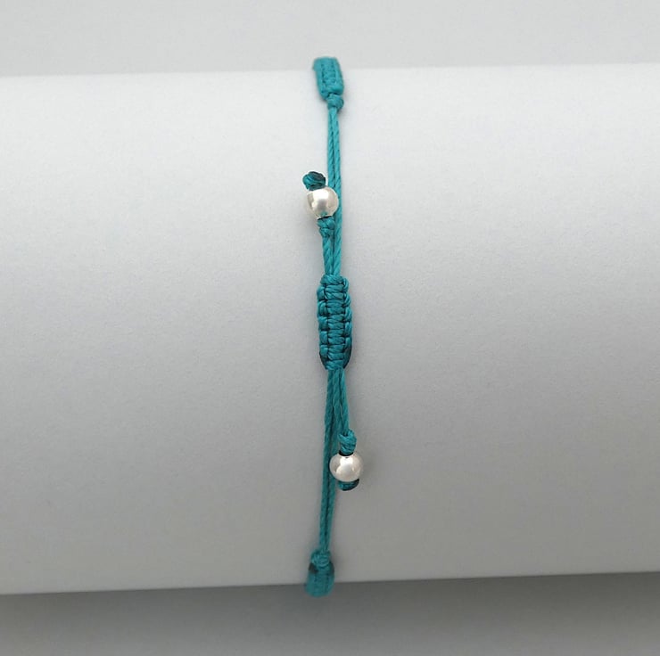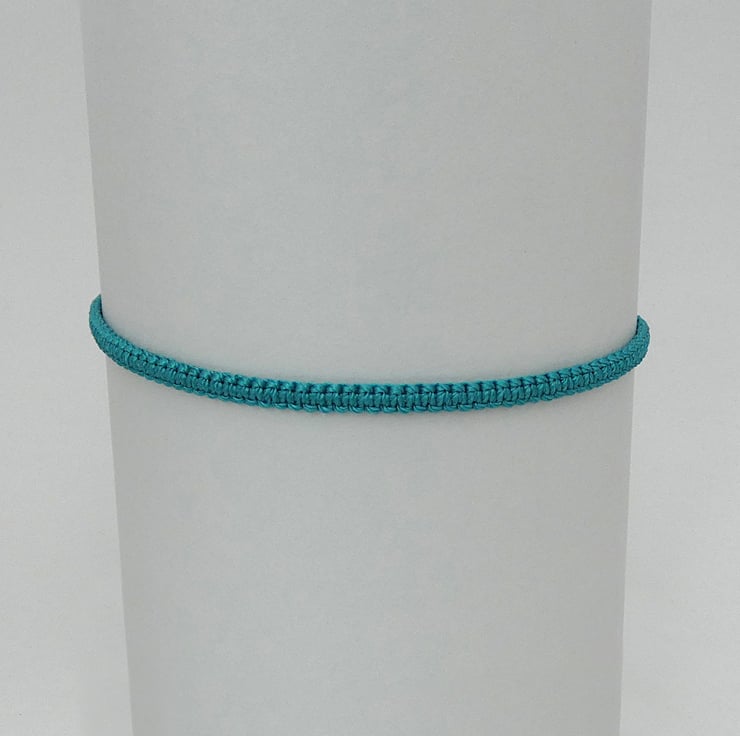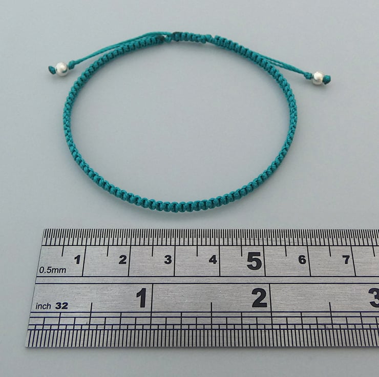 This teal green macramé designed bracelet is handmade in Cornwall with quality nylon cord from the USA. The adjustable sizing 7”to 9.5” means it fits comfortably and it easy to slip over your hand. The silver plated bead ends not only add a touch of elegance but also make it easy to fasten the bracelet yourself.