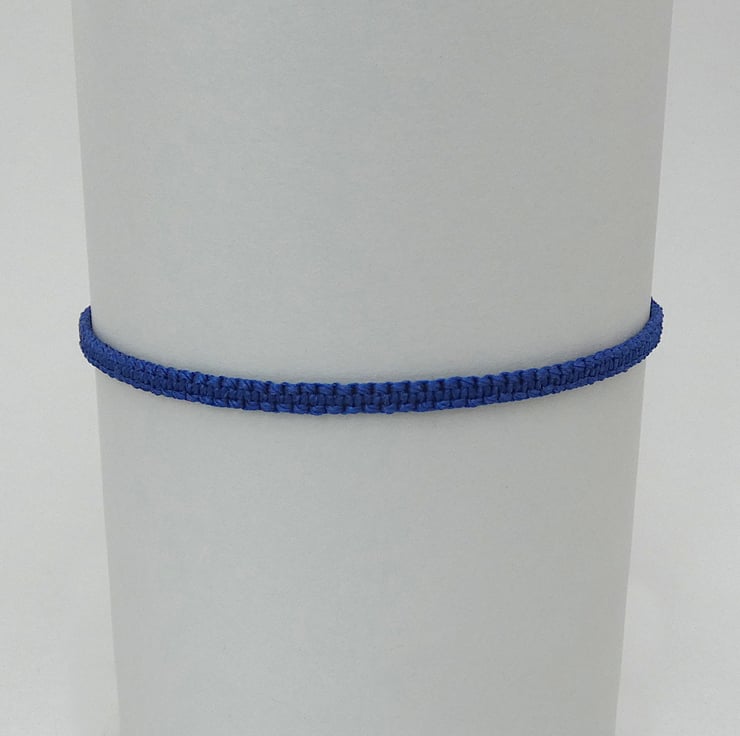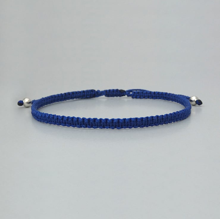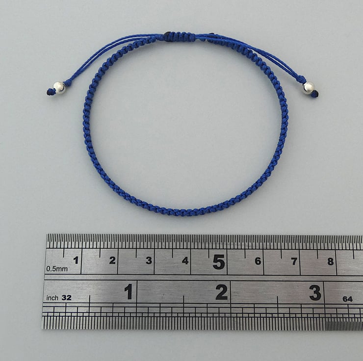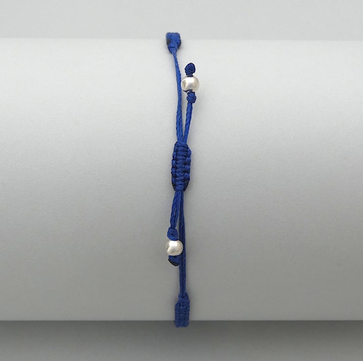 This bright Royal blue macramé designed bracelet is handmade in Cornwall with quality nylon cord from the USA. The adjustable sizing 7”to 9.5” means it fits comfortably and it easy to slip over your hand. The silver plated bead ends not only add a touch of elegance but also make it easy to fasten the bracelet yourself.