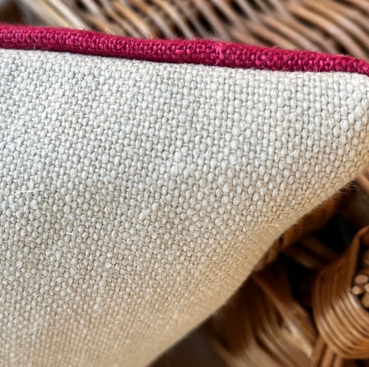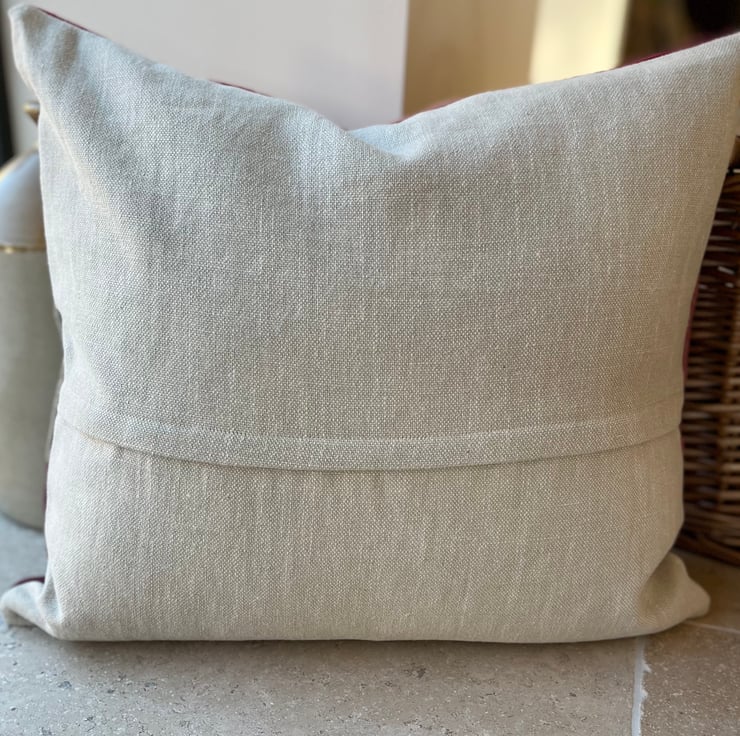 The cover is backed with thick beige linen with a concealed zip. The cover measures approx 20” x 18” and it is pictured filled with a 20” square filler (not included.