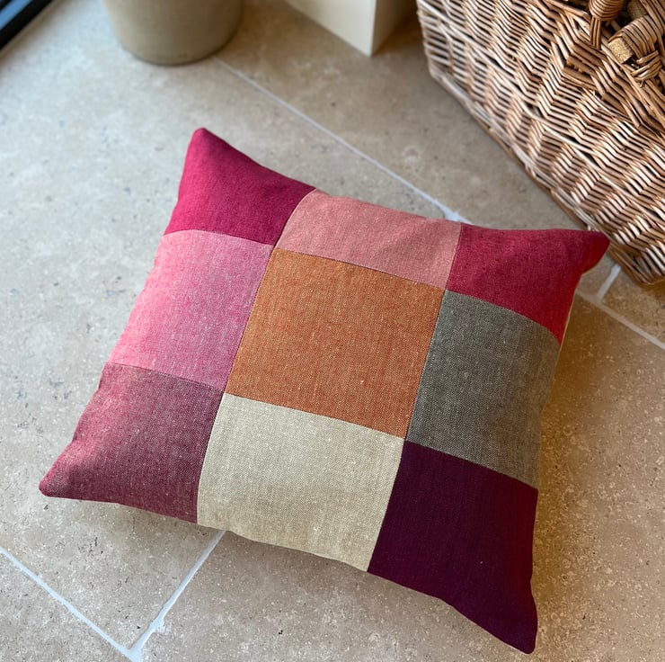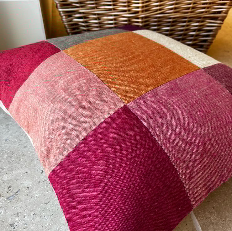 One of a kind cushion cover made from sample swatches of Osborne and Little Sakura Linen. The rich warm colours make an eye-catching feature cushion front.