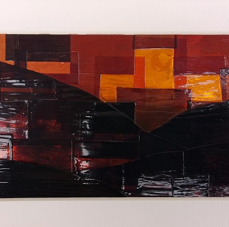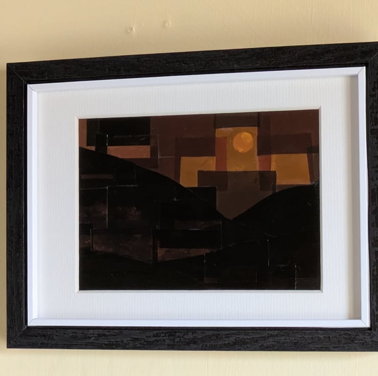 This postcard-size landscape collage is made by piecing photographic negatives over a reflective board. It comes in an 8"x 6" frame.