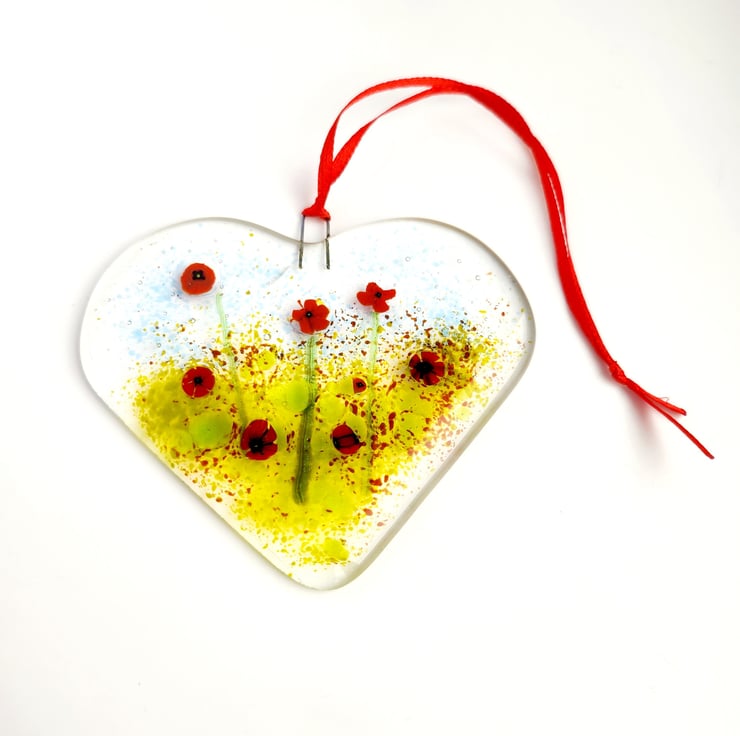 This decorative fused glass suncatcher features flowers on a clear heart background. I have hand-cut two heart shapes and adorned them with colorful glass frit and murrine. The heart is then fired in a kiln to a full fuse, giving the glass a smooth feel. A hook is added before firing. Once fired a coordinating ribbon is attached to the hook.