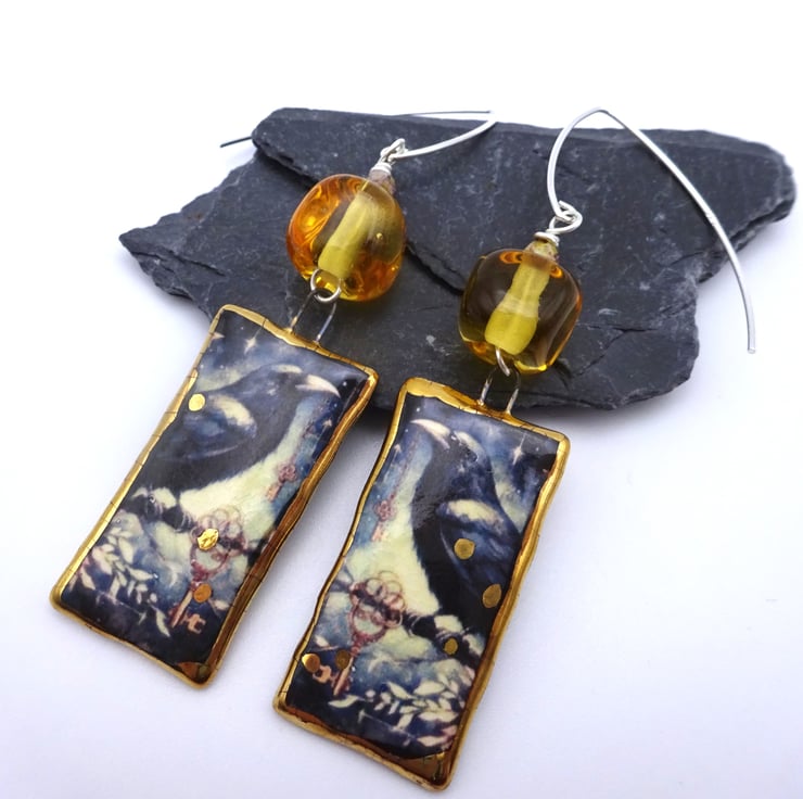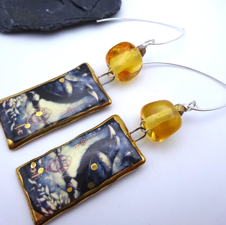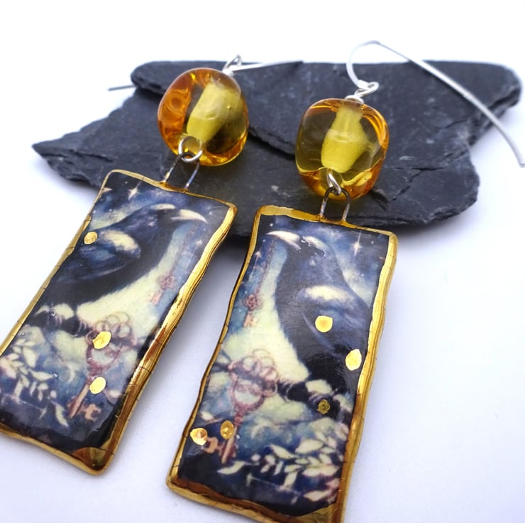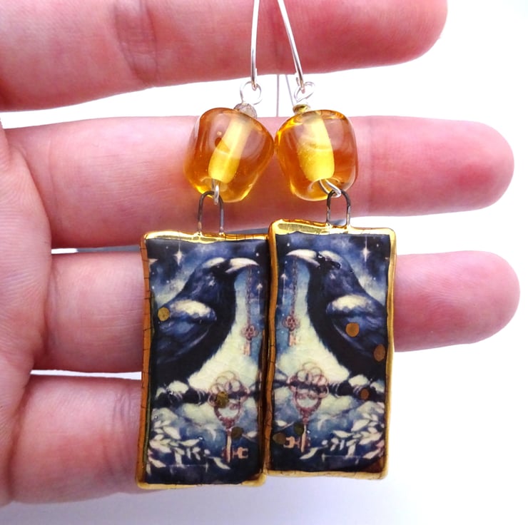 A pair of earrings made with sterling silver ear wires, amber handmade lampwork glass beads and handmade ceramic raven charms.