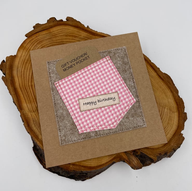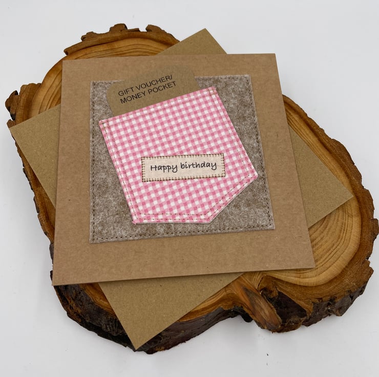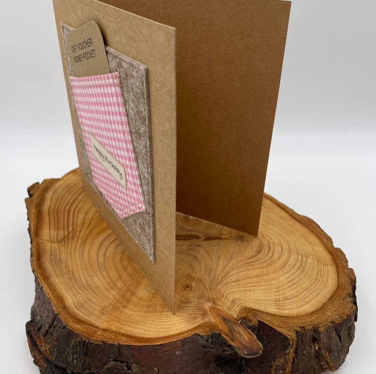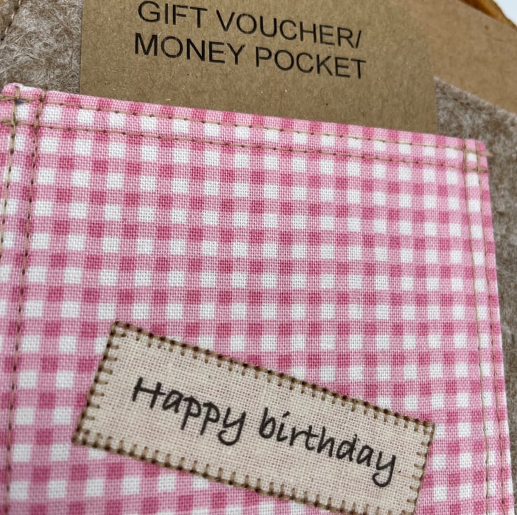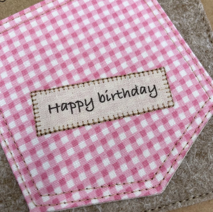 Tuck a little love into this charming pink check pocket, perfect for gifting a bit of birthday cheer. Stitched with care onto soft beige felt, the ‘Happy Birthday’ message adds a handmade touch, while the recycled card backing makes it as kind to the earth as it is to the heart. Whether you're slipping in a gift card or a special note, this sweet little pouch turns even the simplest gift into something extra thoughtful.