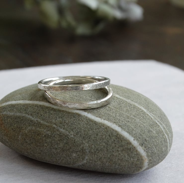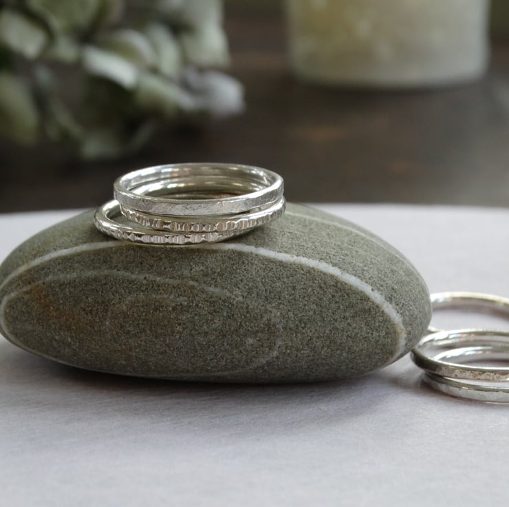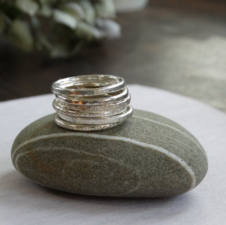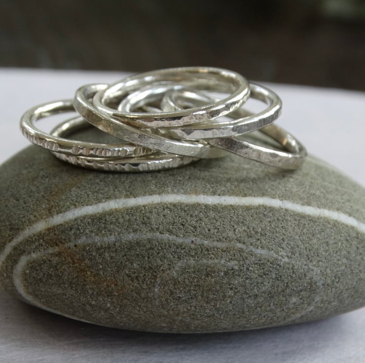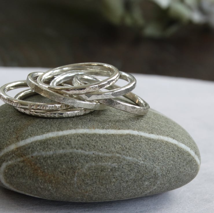 These dainty little stacking rings are each formed by hand from recycled sterling silver. I hammer them in different ways to create a range of textures, so you have a choice of styles. They look lovely worn alone, or stacked up with other rings.