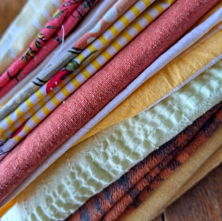 Around 12 pieces of new, rescued and vintage cotton and linen fabric in life-affirming oranges and yellows. There are some bits of golden-yellow velour thrown in as well just for fun.
