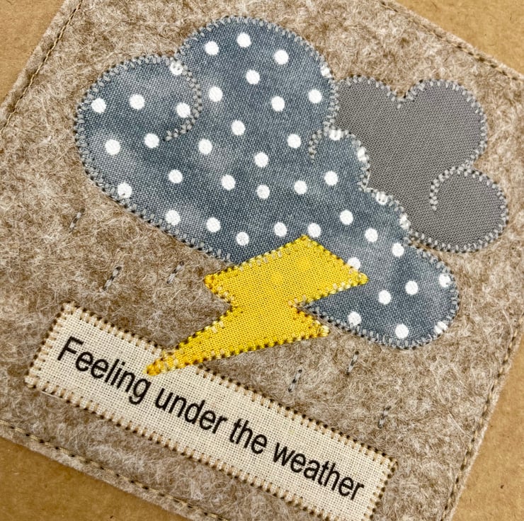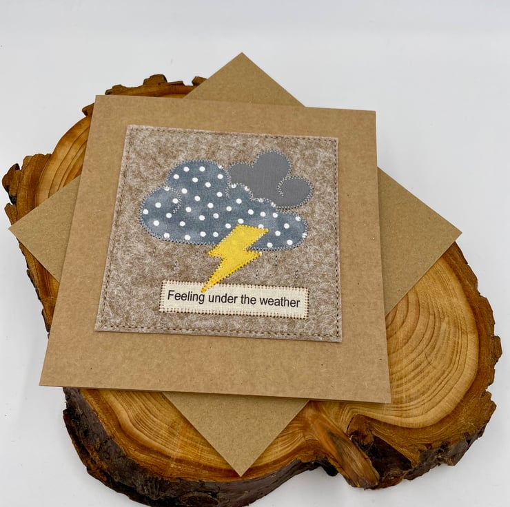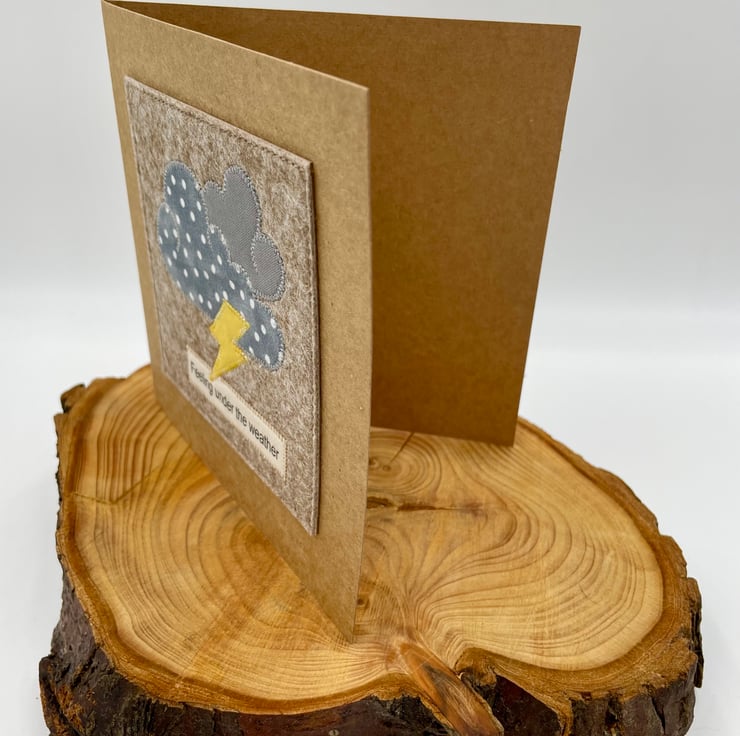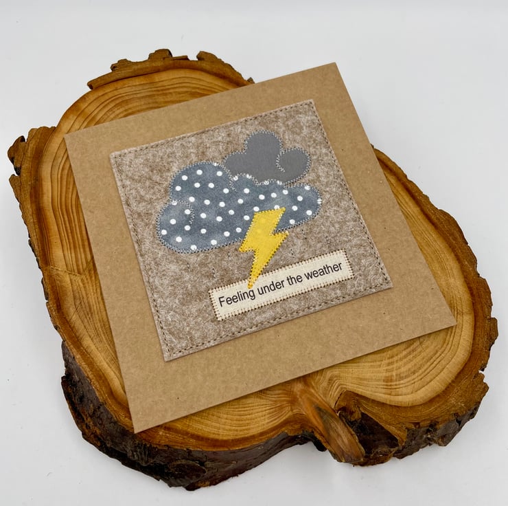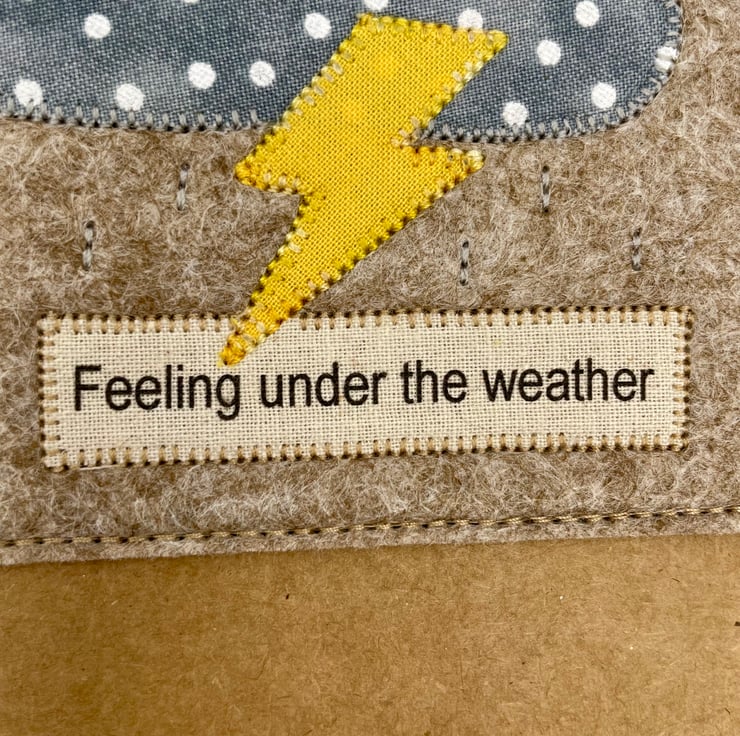 When the storm clouds roll in, a little kindness goes a long way. This heartfelt get well card features an appliqué design of rain clouds and a striking bolt of lightning, stitched from soft fabrics to bring a handmade touch. The ‘Feeling Under the Weather’ message is lovingly blanket stitched onto beige felt, all set against a recycled card—because even cloudy days deserve a little sunshine. A thoughtful way to send warmth and well wishes to someone in need of a pick-me-up.