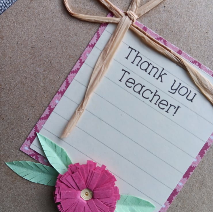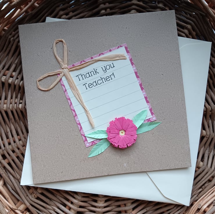 The card is made with a brown kraft card, some patterned paper and lined paper with the word printed on. It is finished with a quilled flower and plain raffia.