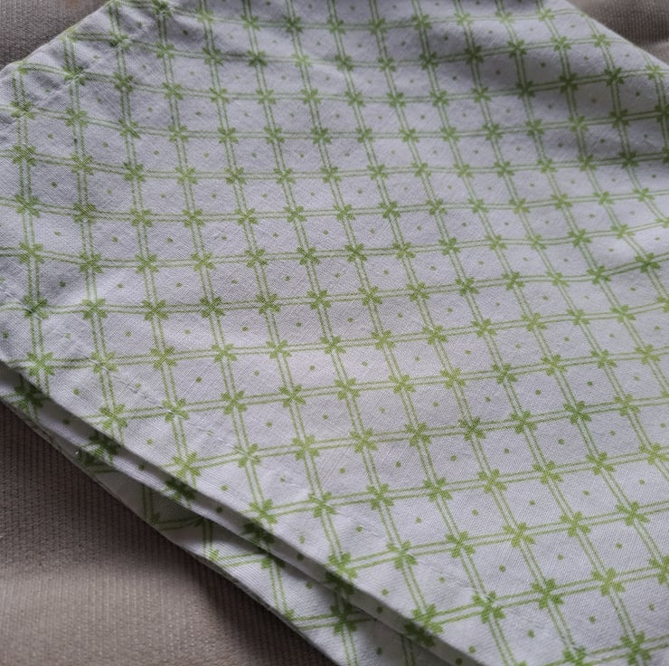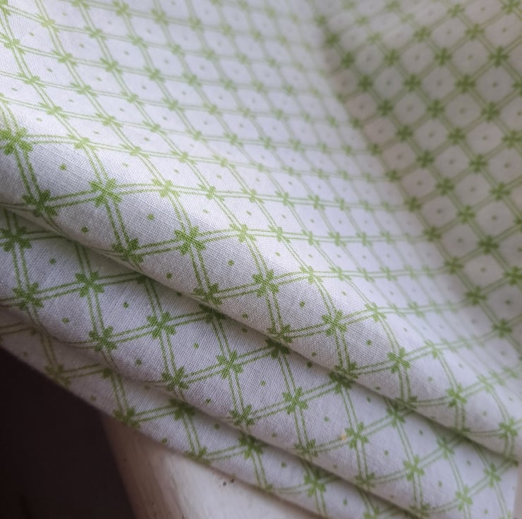 Three pristine Laura Ashley cotton napkins, with a green latticework design on a white background. I've left them hemmed for you to do with as you wish - add them to a sewing project or dab the corners of your mouth with them. Unstained and good as new and measuring 40cm squared.