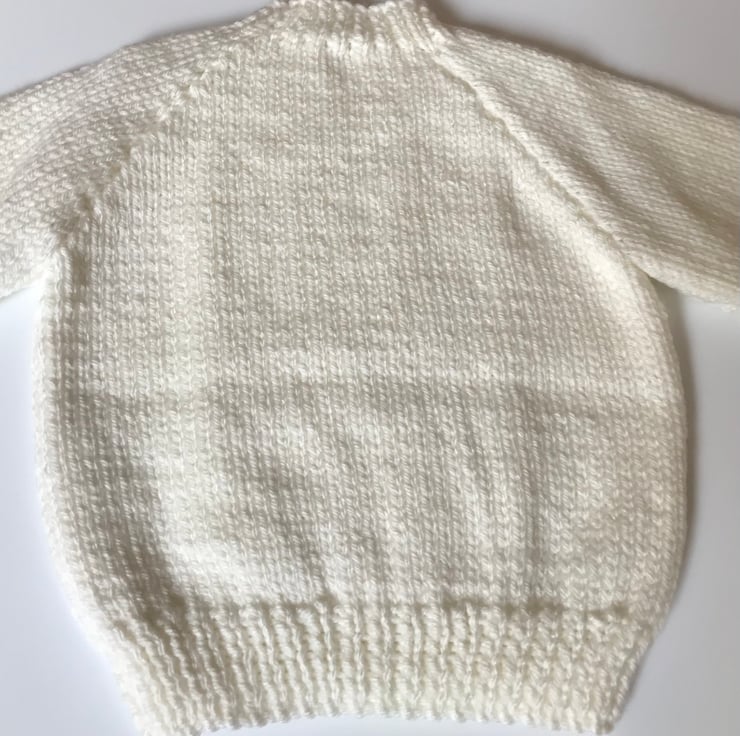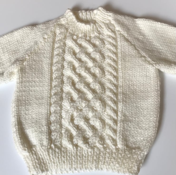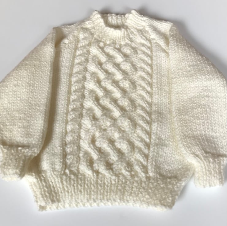Beautiful cream baby jumper hand knitted by me in my Suffolk home. I have used is a wonderfully soft and warm merino wool and acrylic mix chunky yarn to knit this versatile jumper that would suit a boy or girl from approximately 18 months.