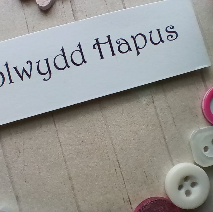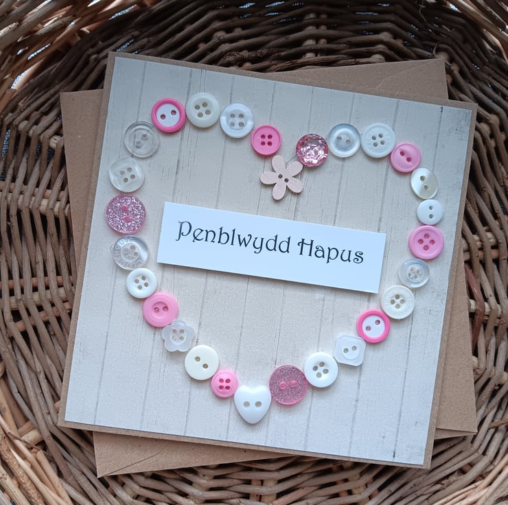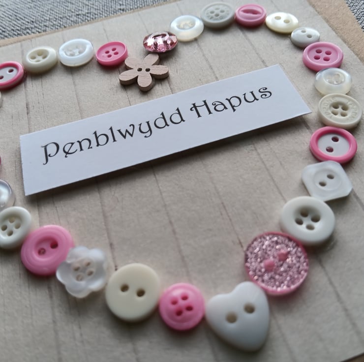 The card is made using a brown kraft card lined with pale patterned paper. The buttons are carefully selected to create a pleasing effect. The words "Penblwydd Hapus" (Happy Birthday in Welsh) are slightly raised. The card comes with a square brown envelope.